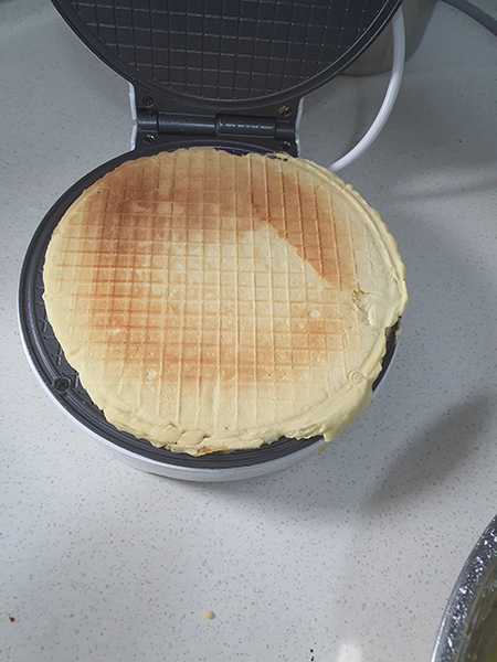 와플은 굽자마자 꺼내면 말랑말랑하지만, 금방 식어서 단단해지기 때문에 이 단계에서 휘리릭 빠르게 해줘야해요!