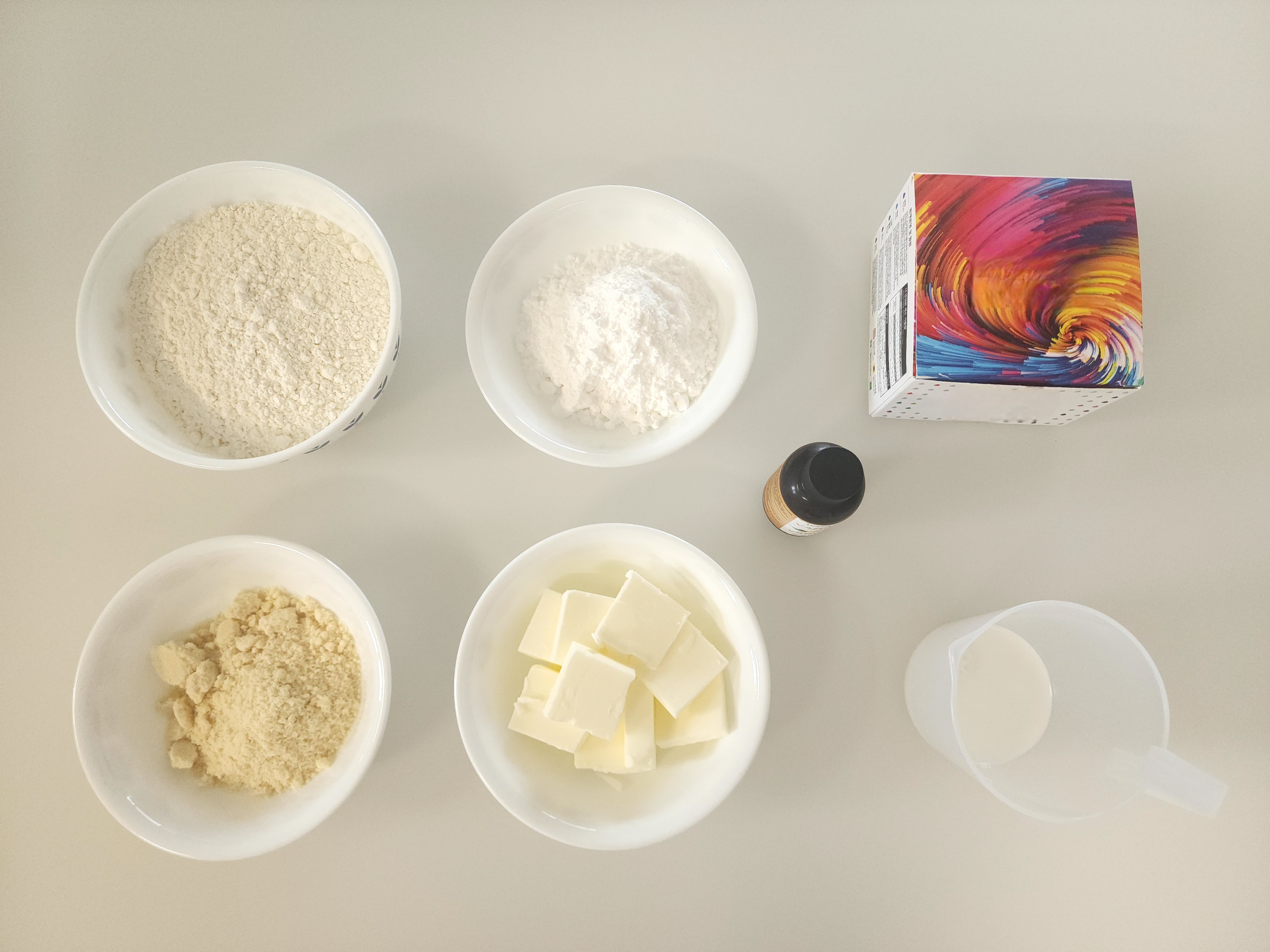 박력분(밀가루) 150g, 슈가파우더(설탕) 60g, 아몬드가루(아몬드) 30g, 바닐라 익스트랙(바닐라빈) 소량