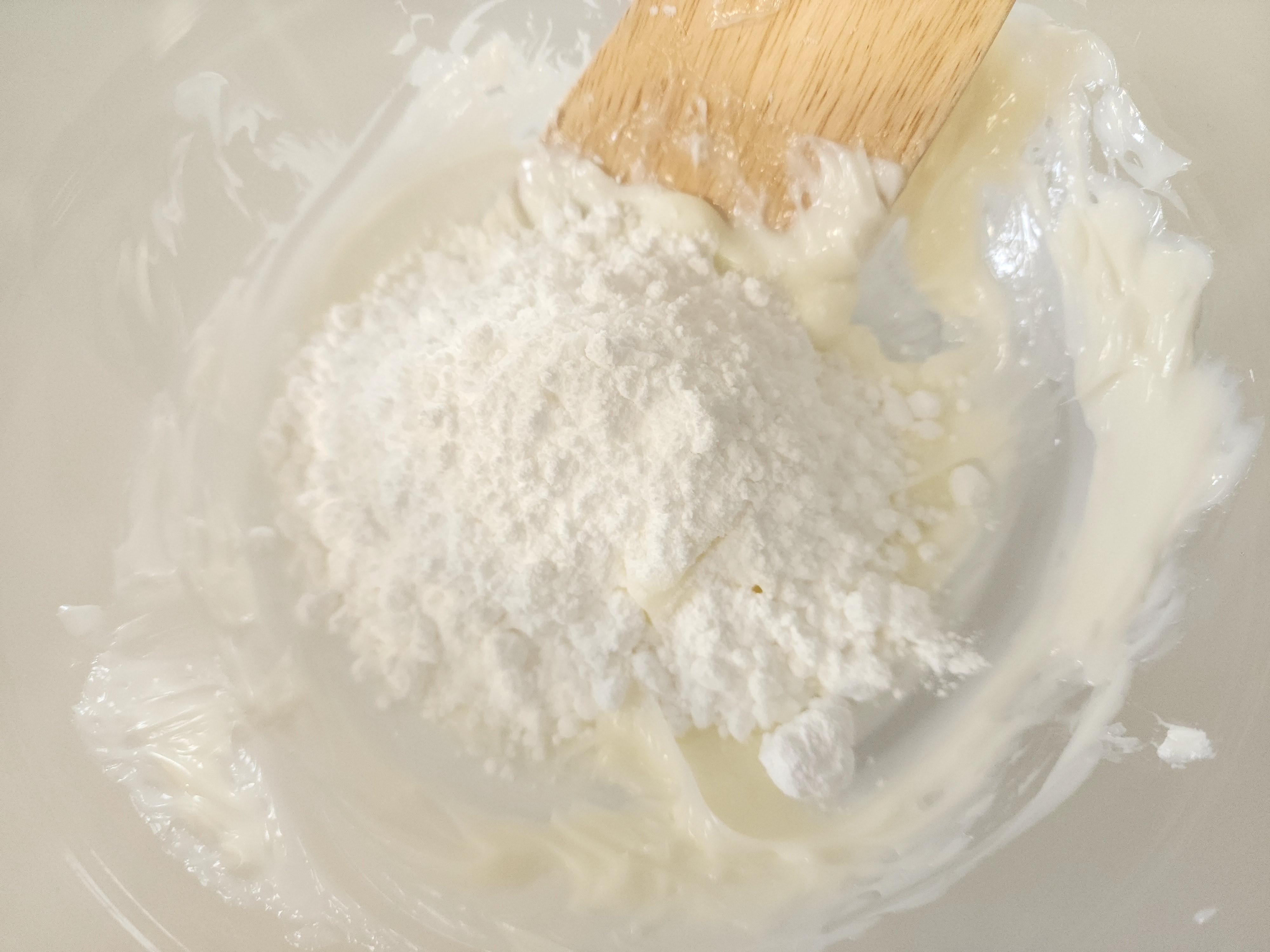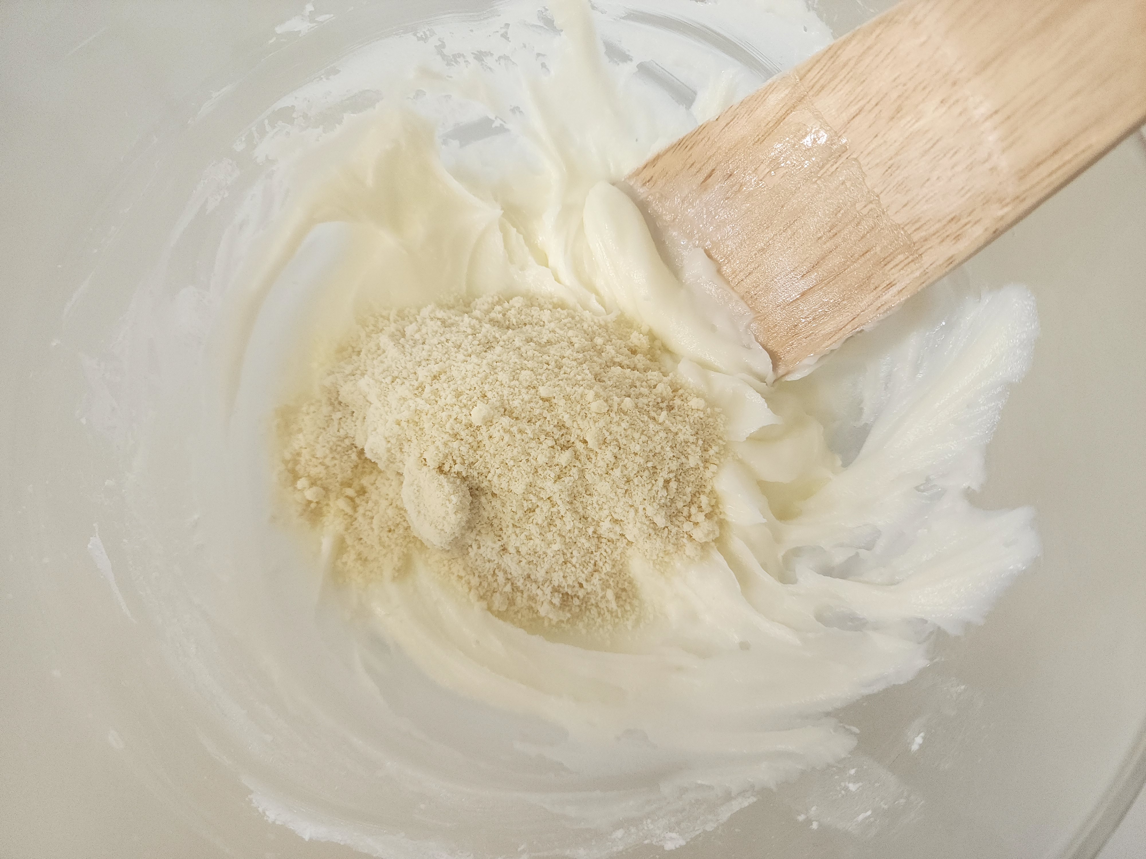 2. 어느정도 풀어진 버터 위에 슈가파우더를 모두 넣고 잘 섞어줍니다! 가루가 보이지 않을때 까지 섞습니다!