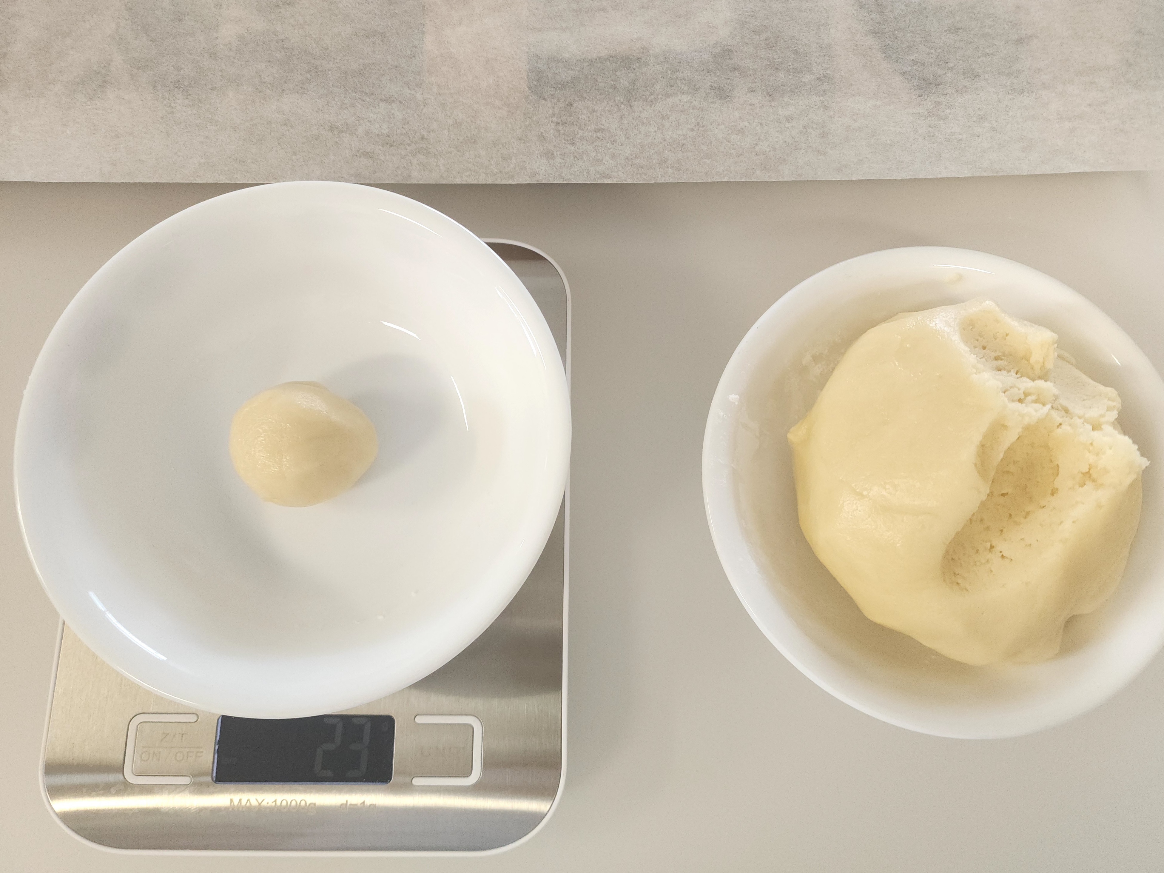 10. 350 ÷ 15 = 23.33333 이므로 소크 하나당 23g의 반죽으로 소분해줍니다!
