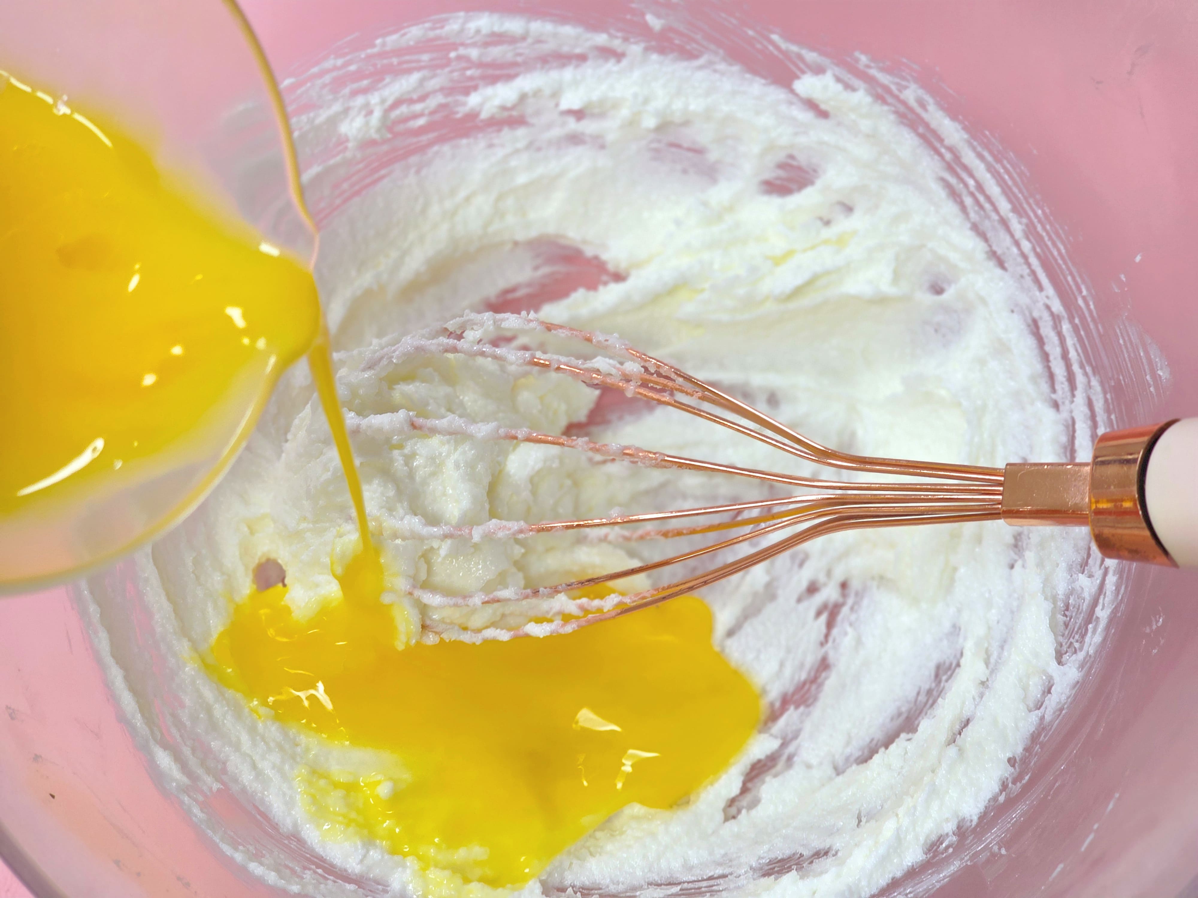 설탕 입자가 작아지면 계란을 세 번 정도 나눠 넣으며 빠르게 휘핑합니다!