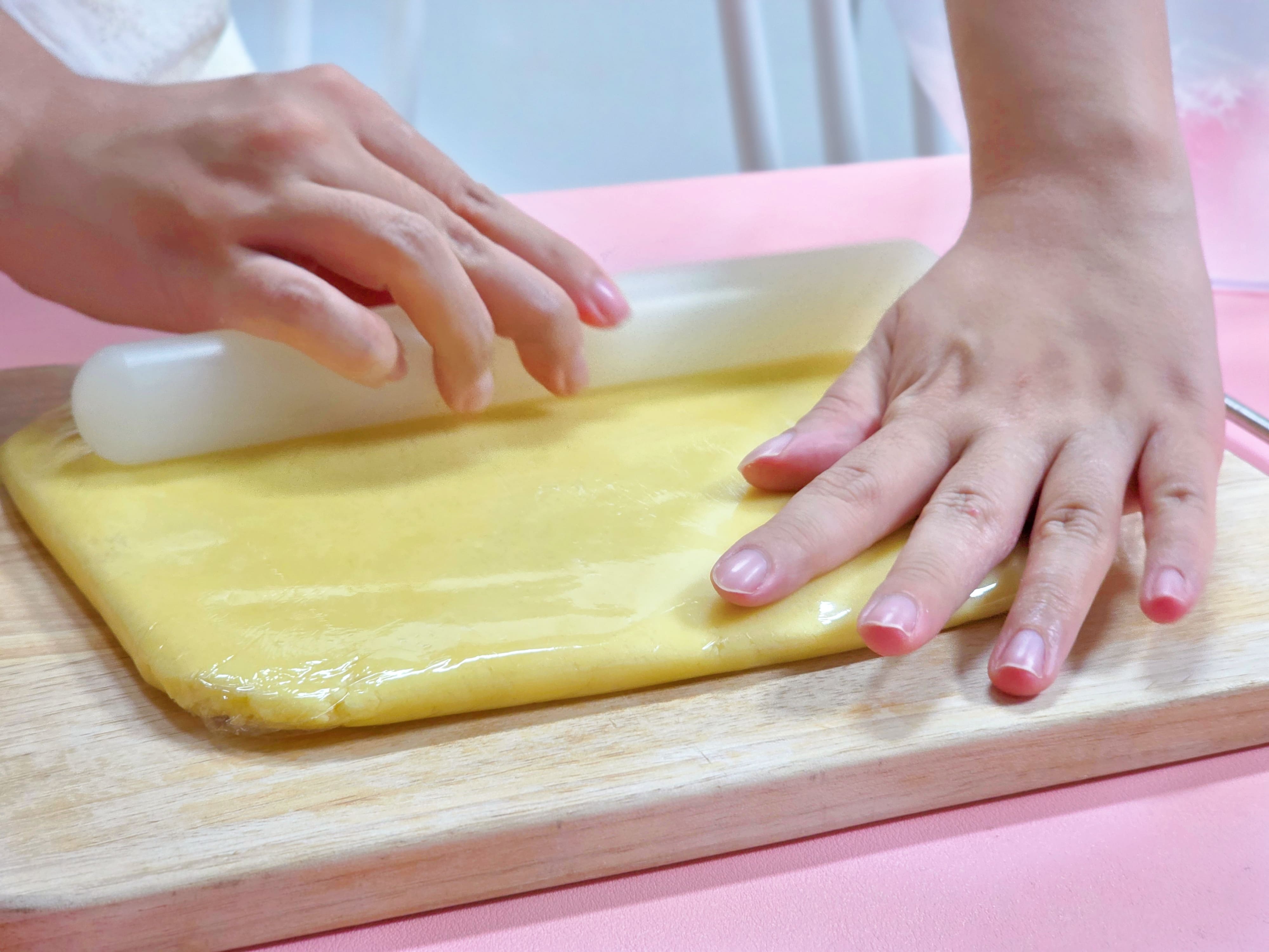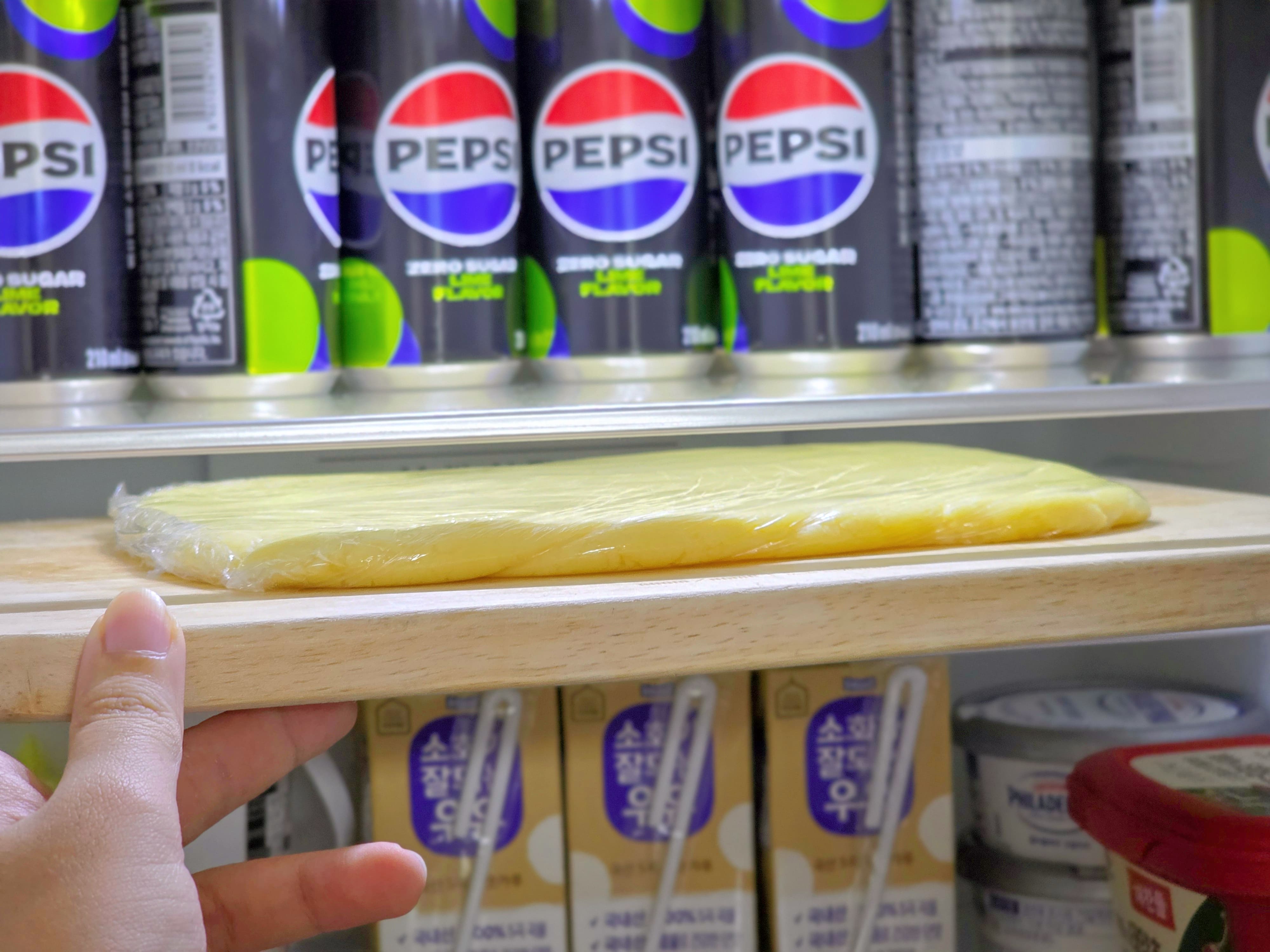 덩어리로 대충 뭉쳐주고 랩에 싸서 일정한 두께로 펼쳐준 뒤 잠시 냉장 보관해줍니다~