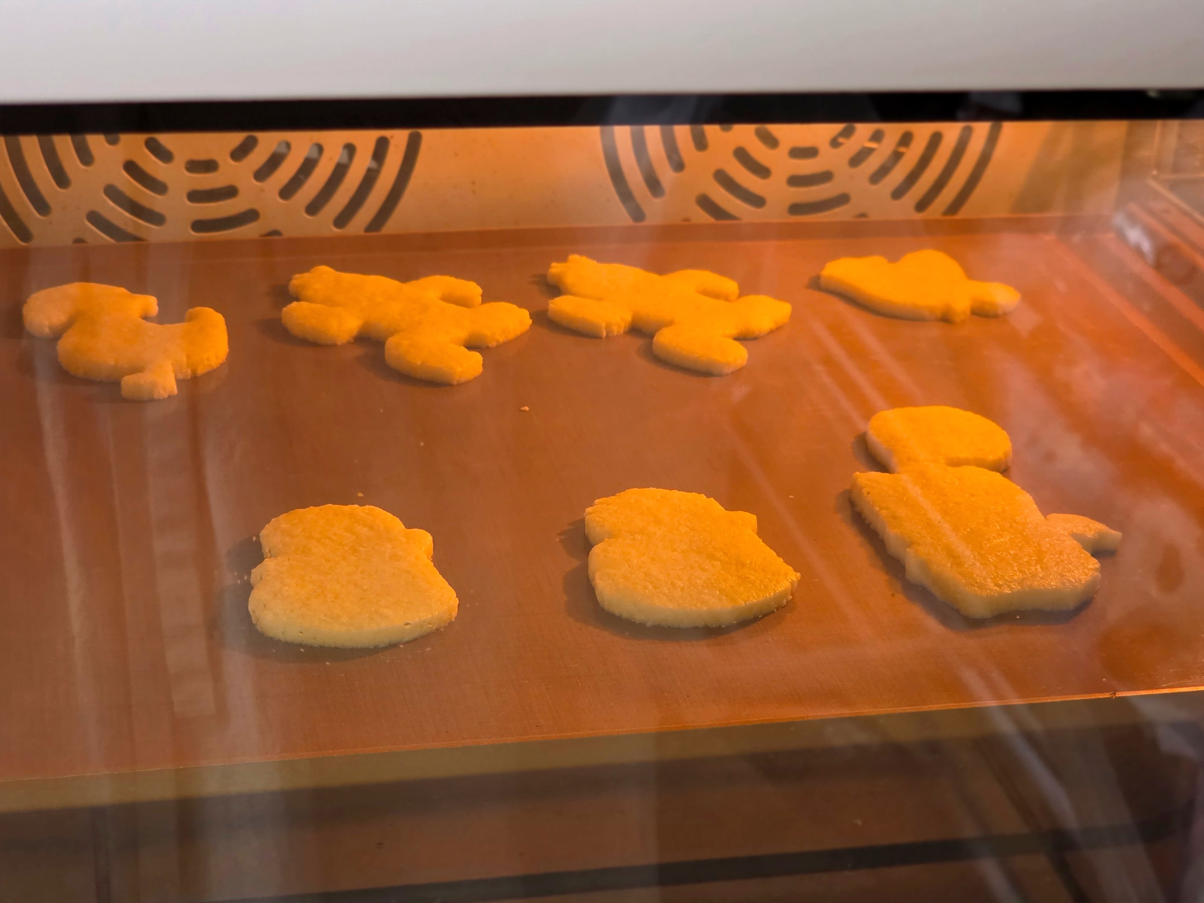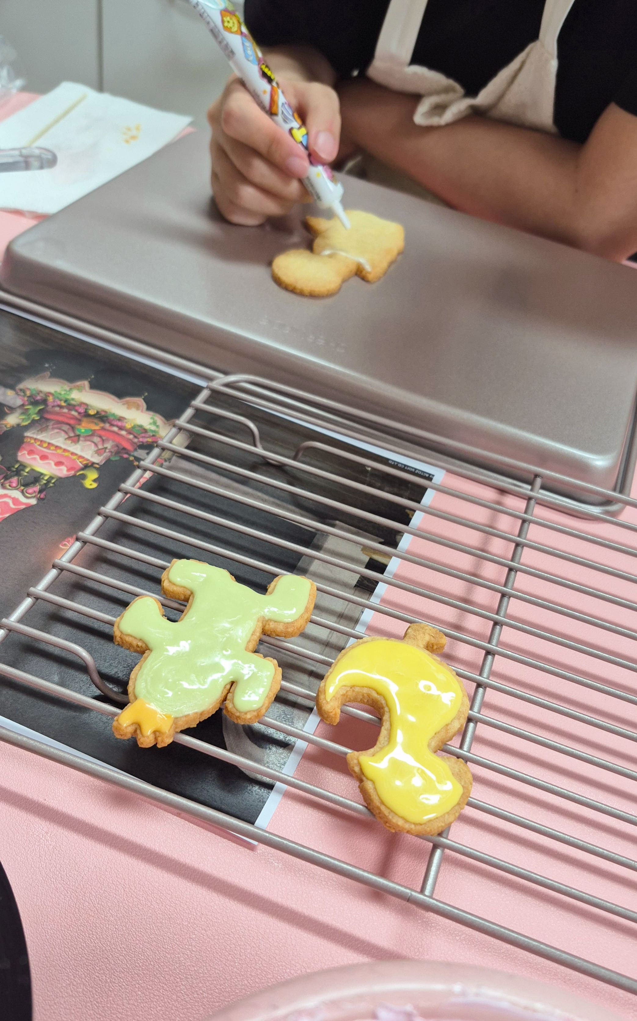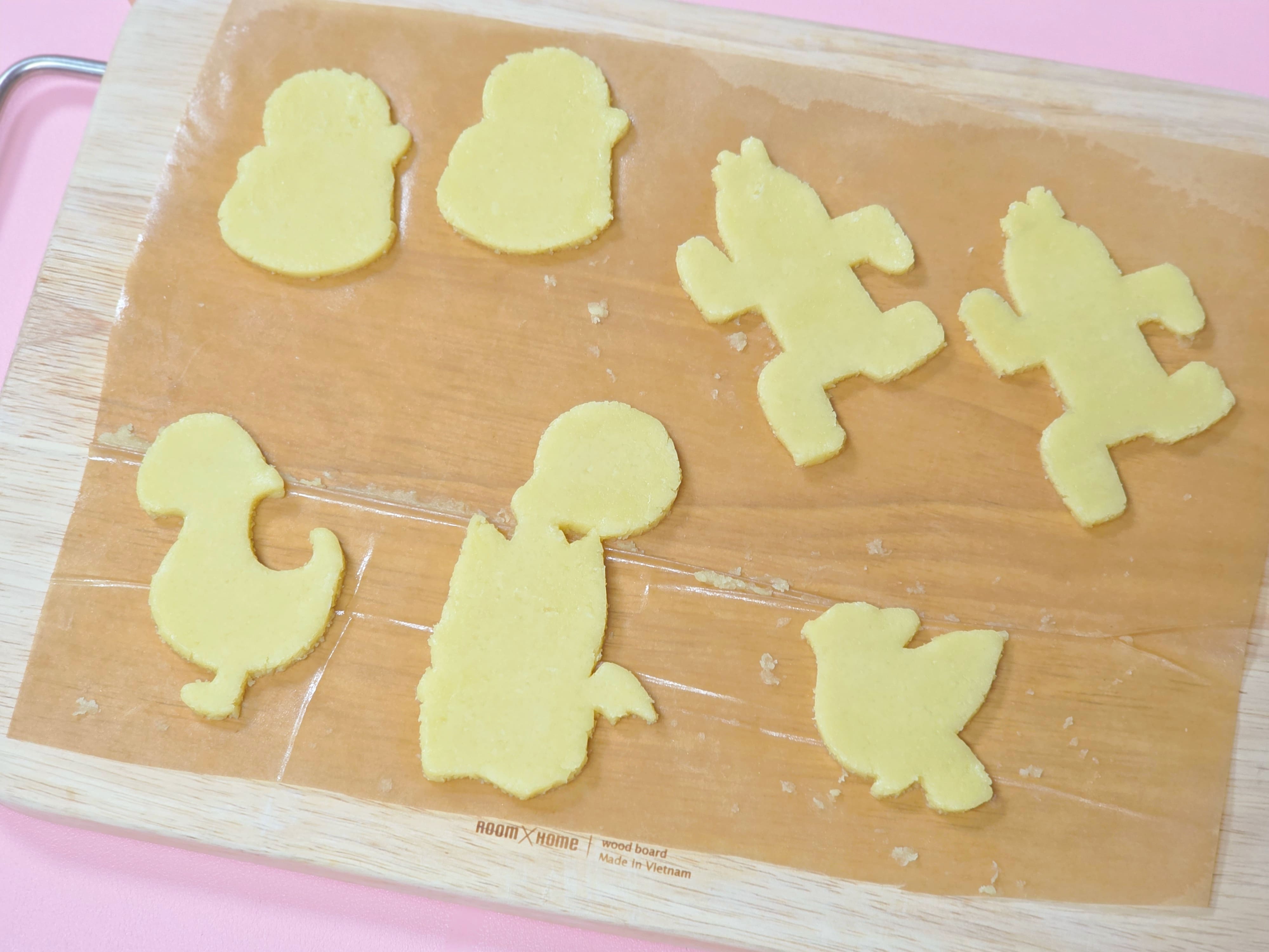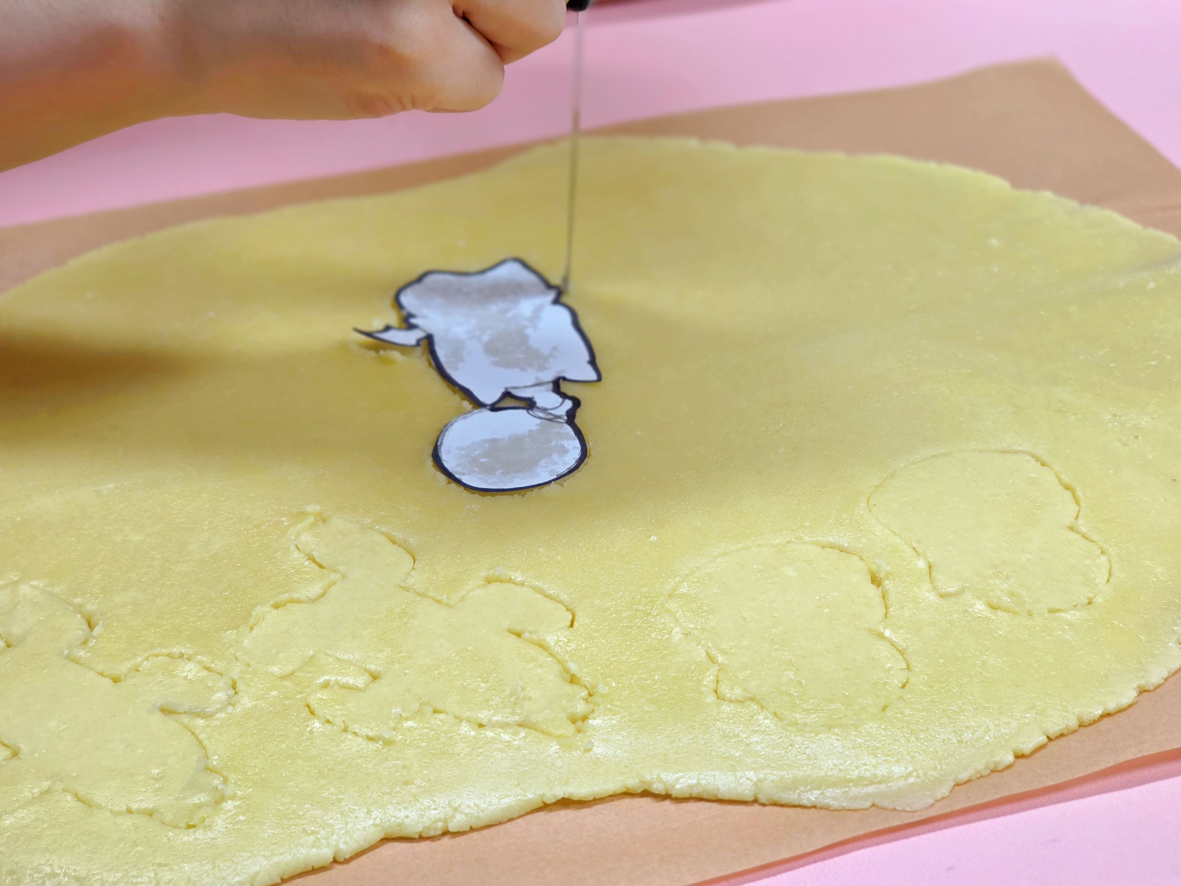 베이킹 시트와 밀대를 이용해서 원하는 두께로 밀어 펴주고 한땀 한땀 그려서 만든 쿠키커터(??)로 모양을 만들어줍니다.