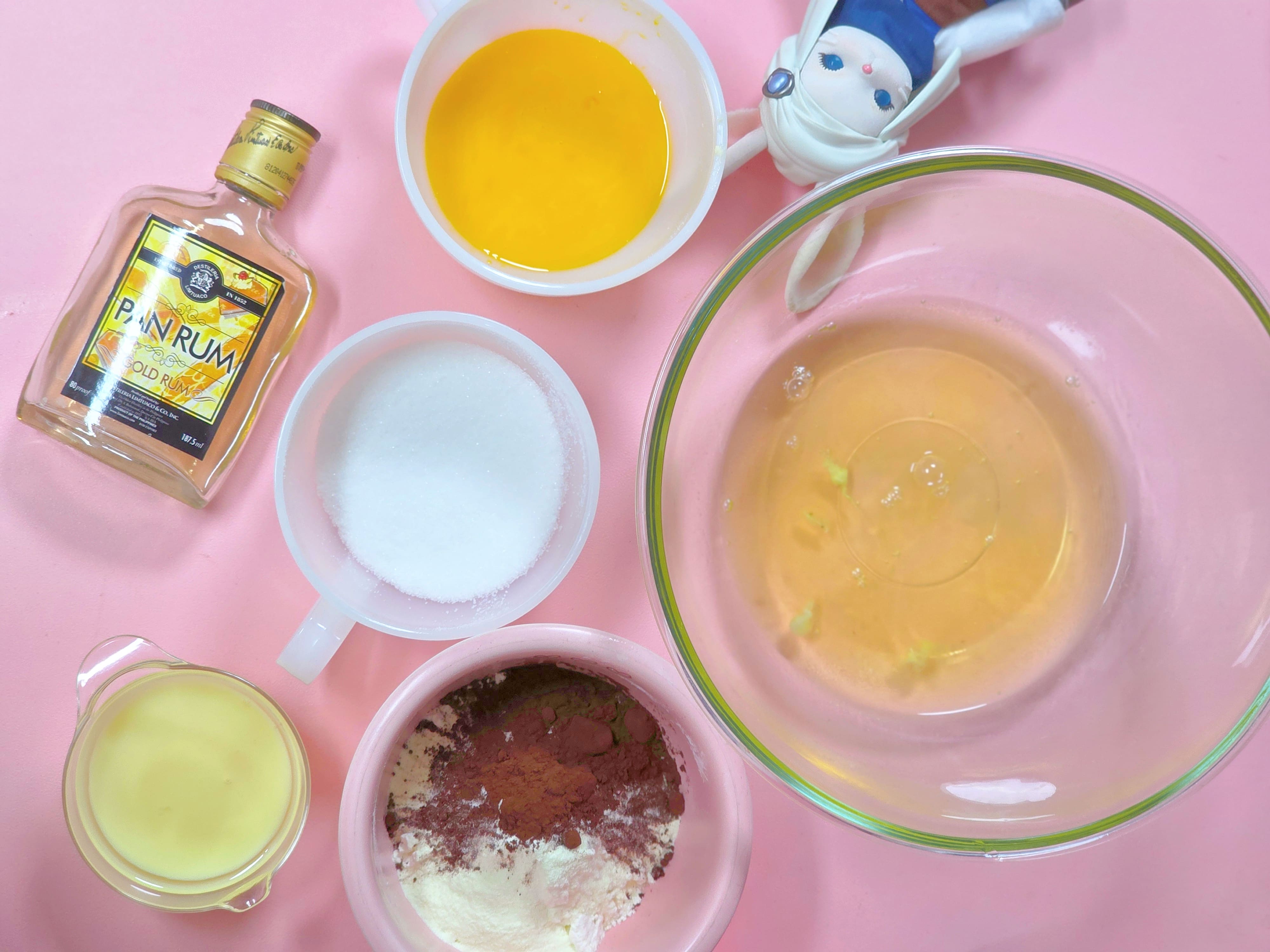 달걀 흰자, 달걀 노른자, 설탕, 박력분, 탈지분유, 코코아 파우더, 연유, 식용유, 럼