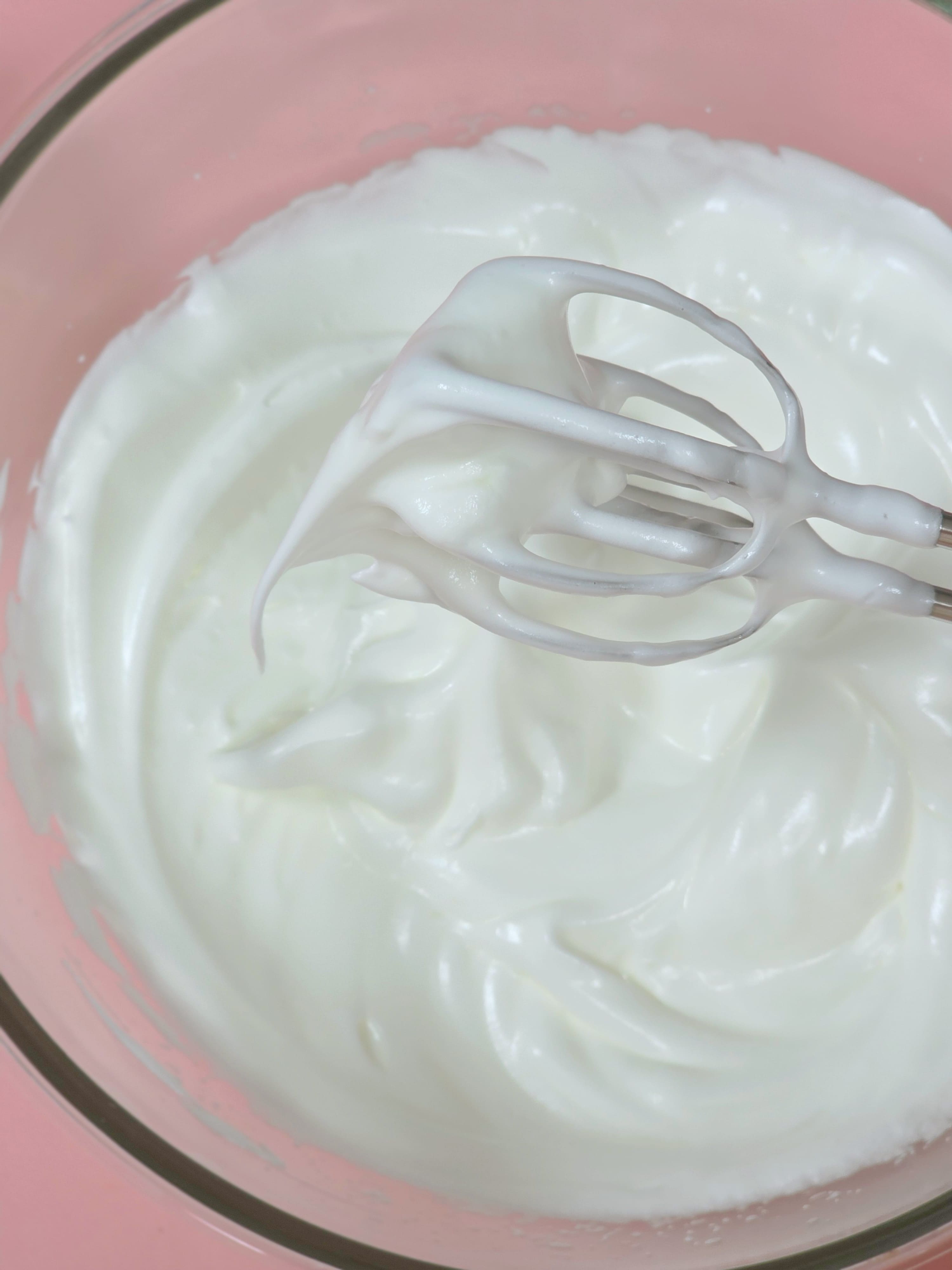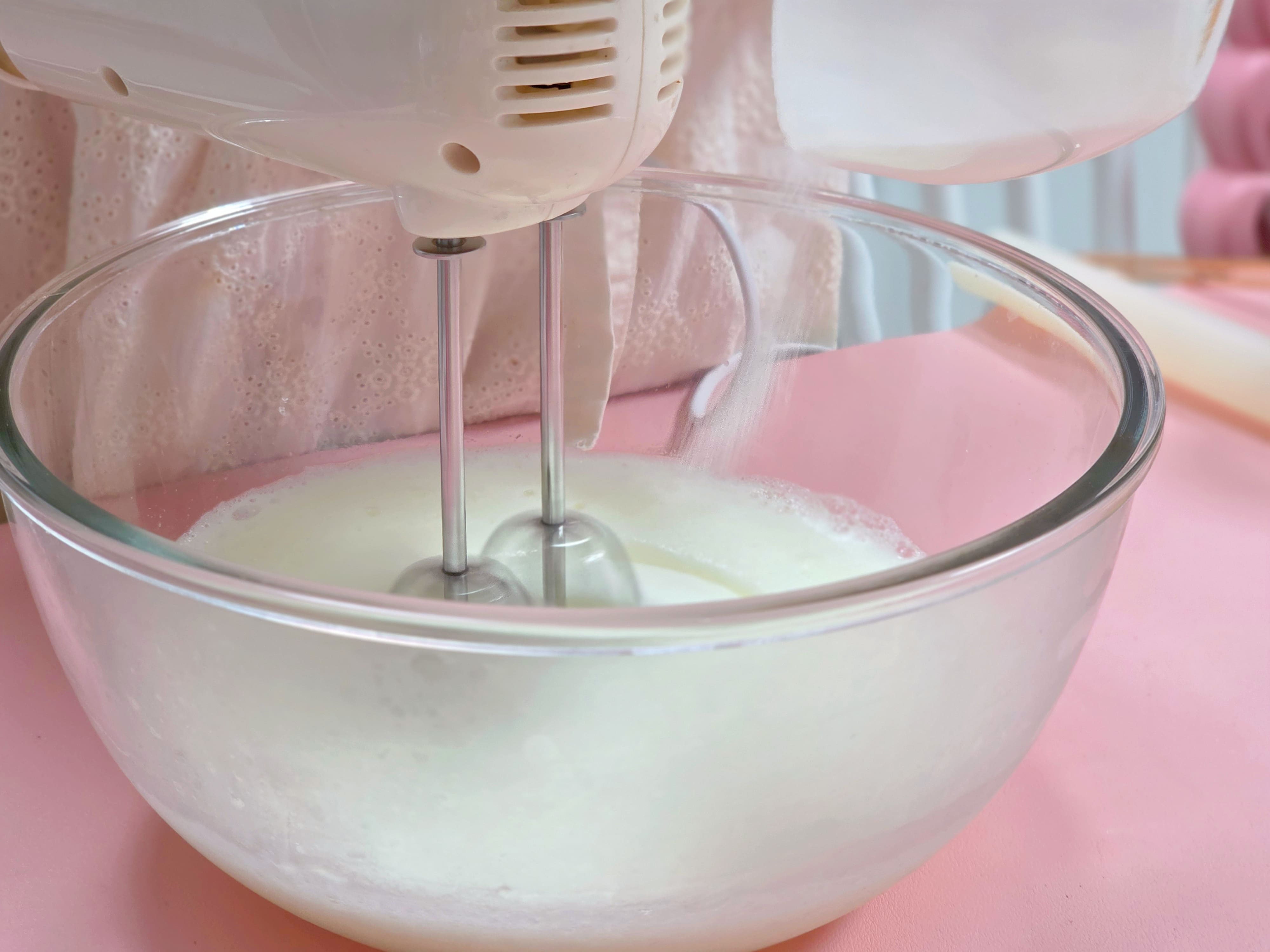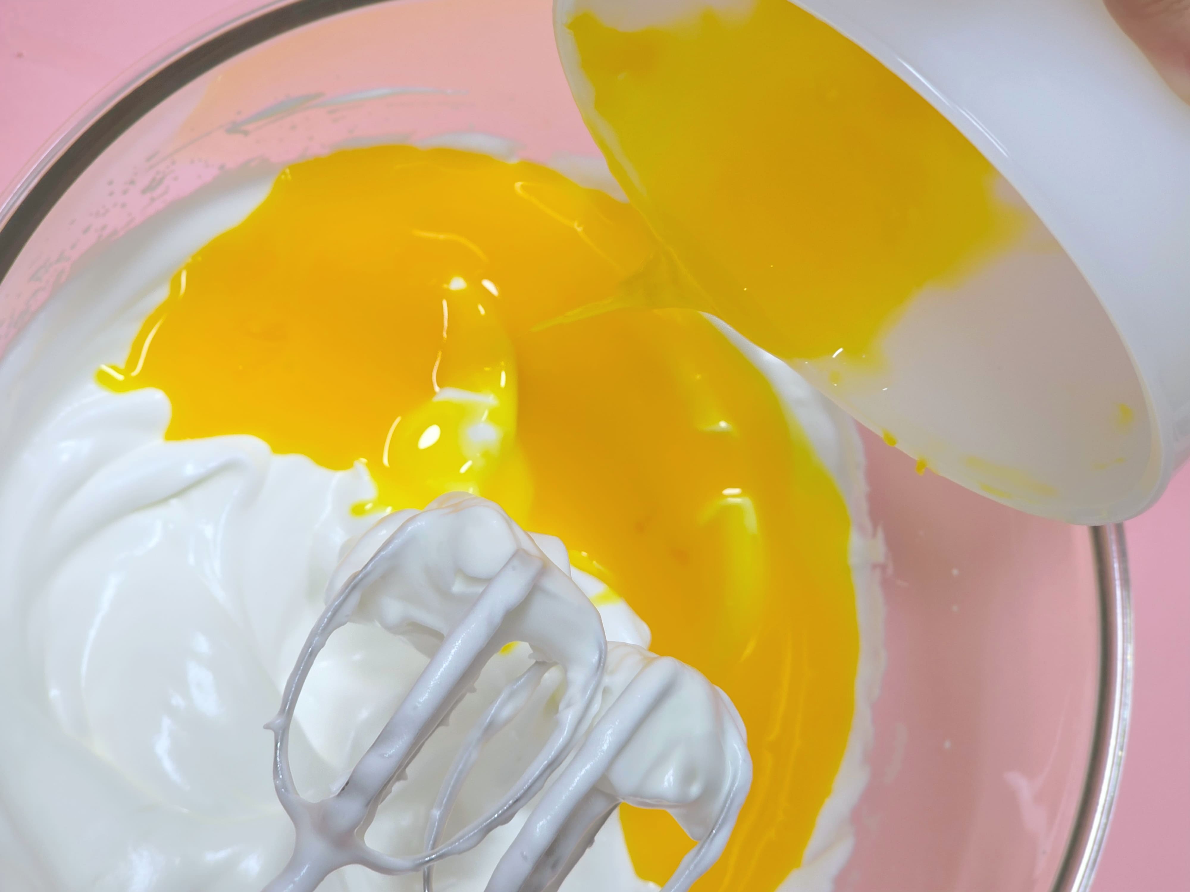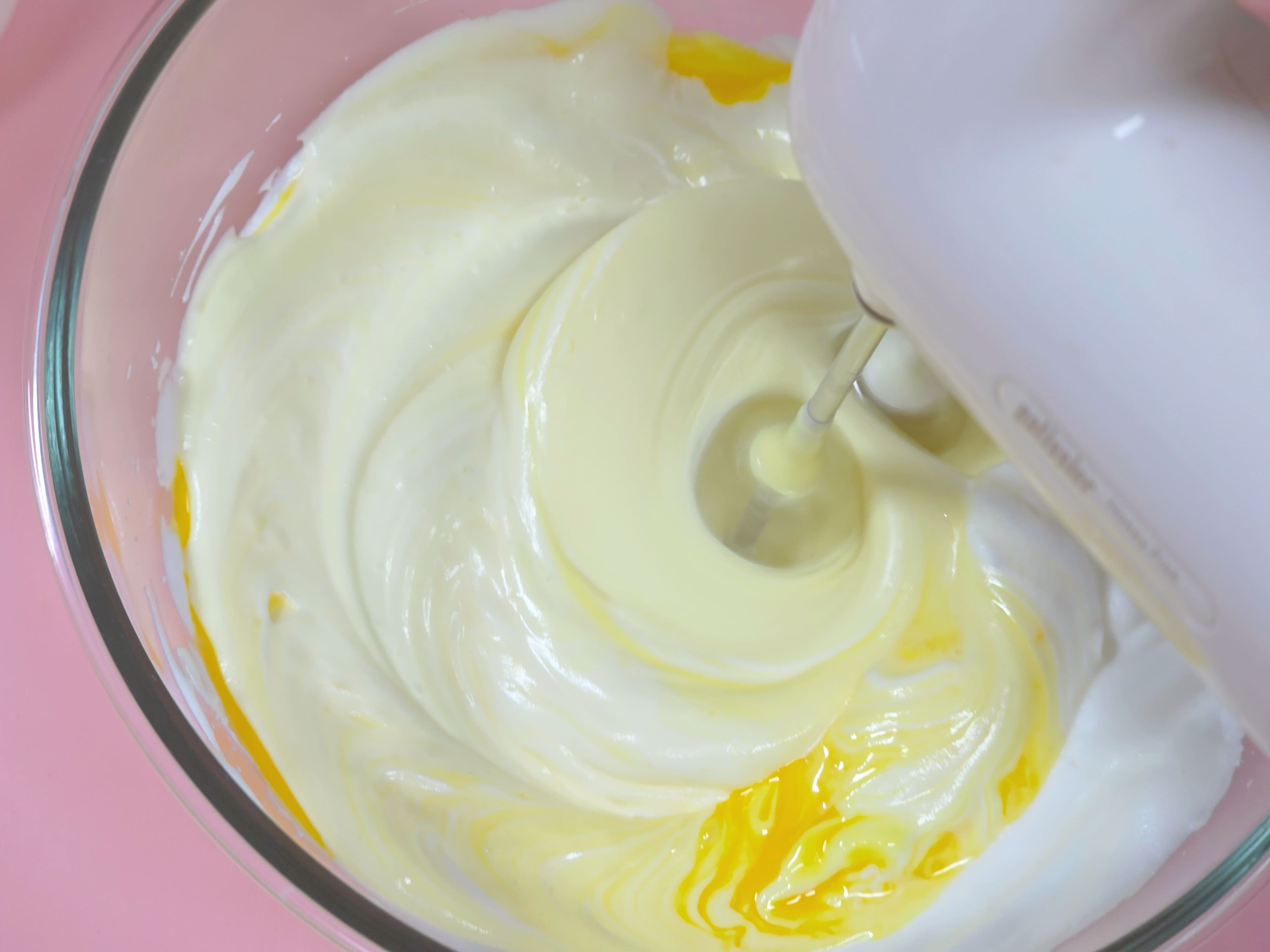 설탕을 세 번에 나눠서 휘핑해주고 부드러운 뿔이 생기면 노른자를 섞어줍니다!