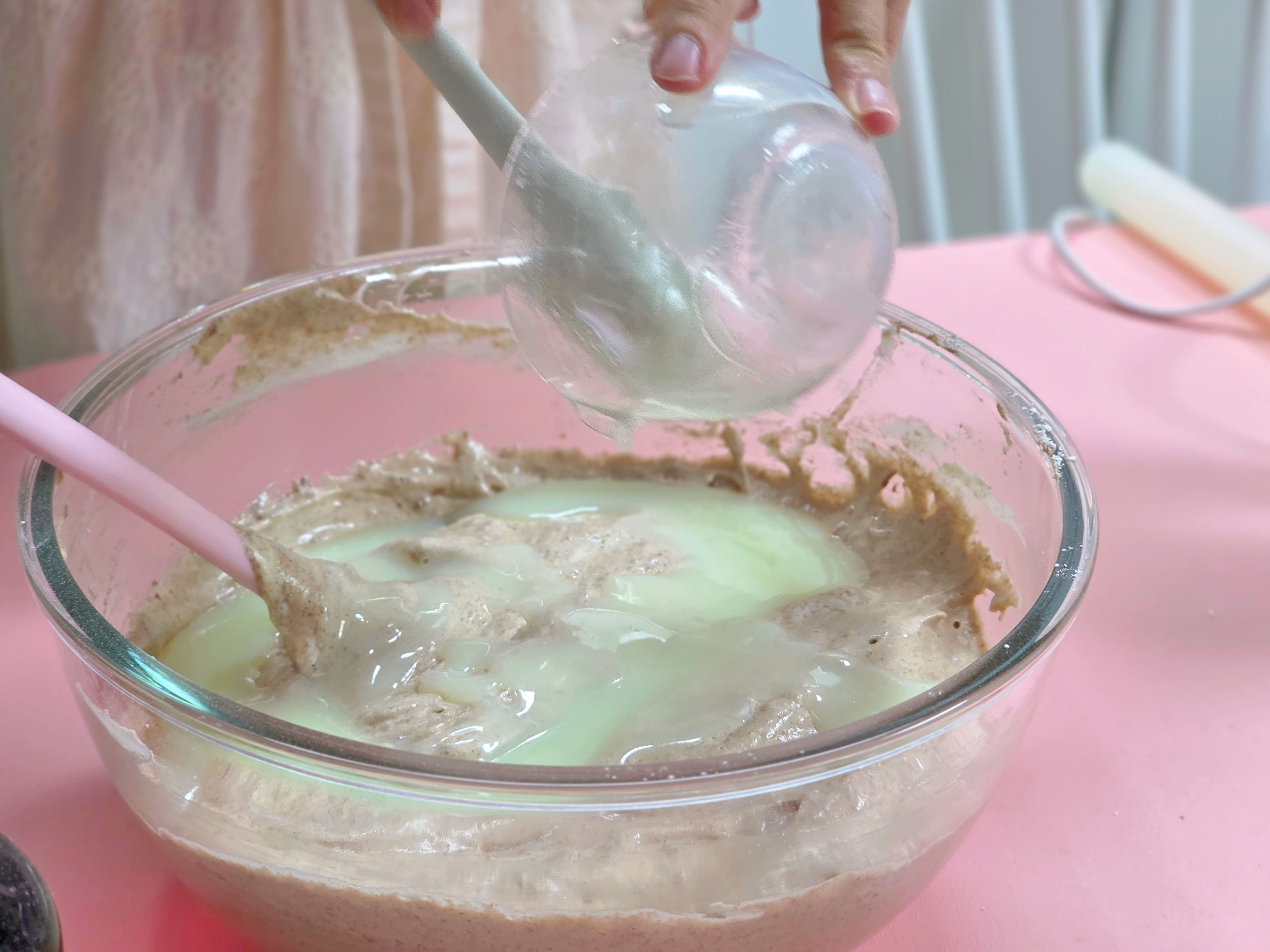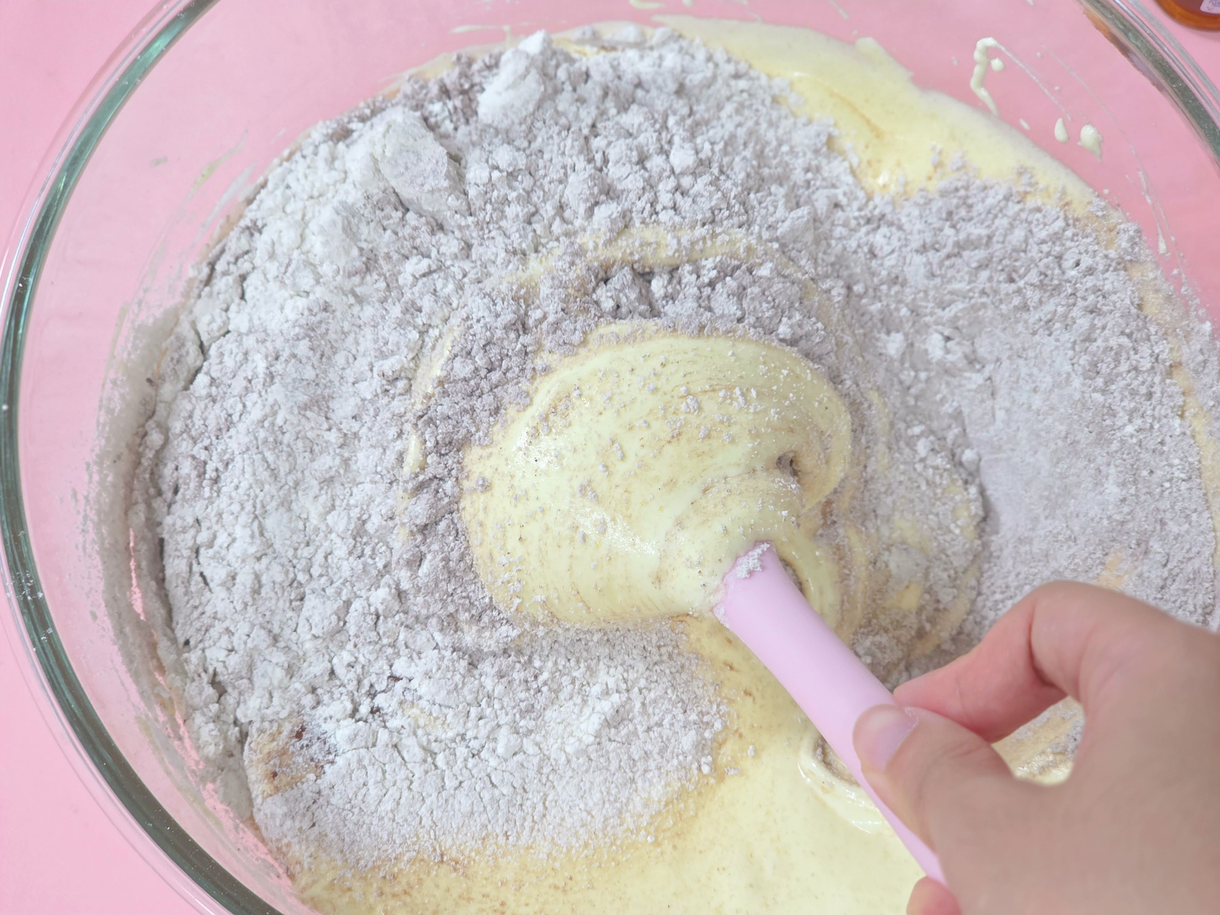 가루가 보이지 않을 정도로만 가볍게 섞어준 뒤 연유와 식용유, 럼 섞은 것을 부어 퍼 올리듯이 빠르게 섞어줍시다!