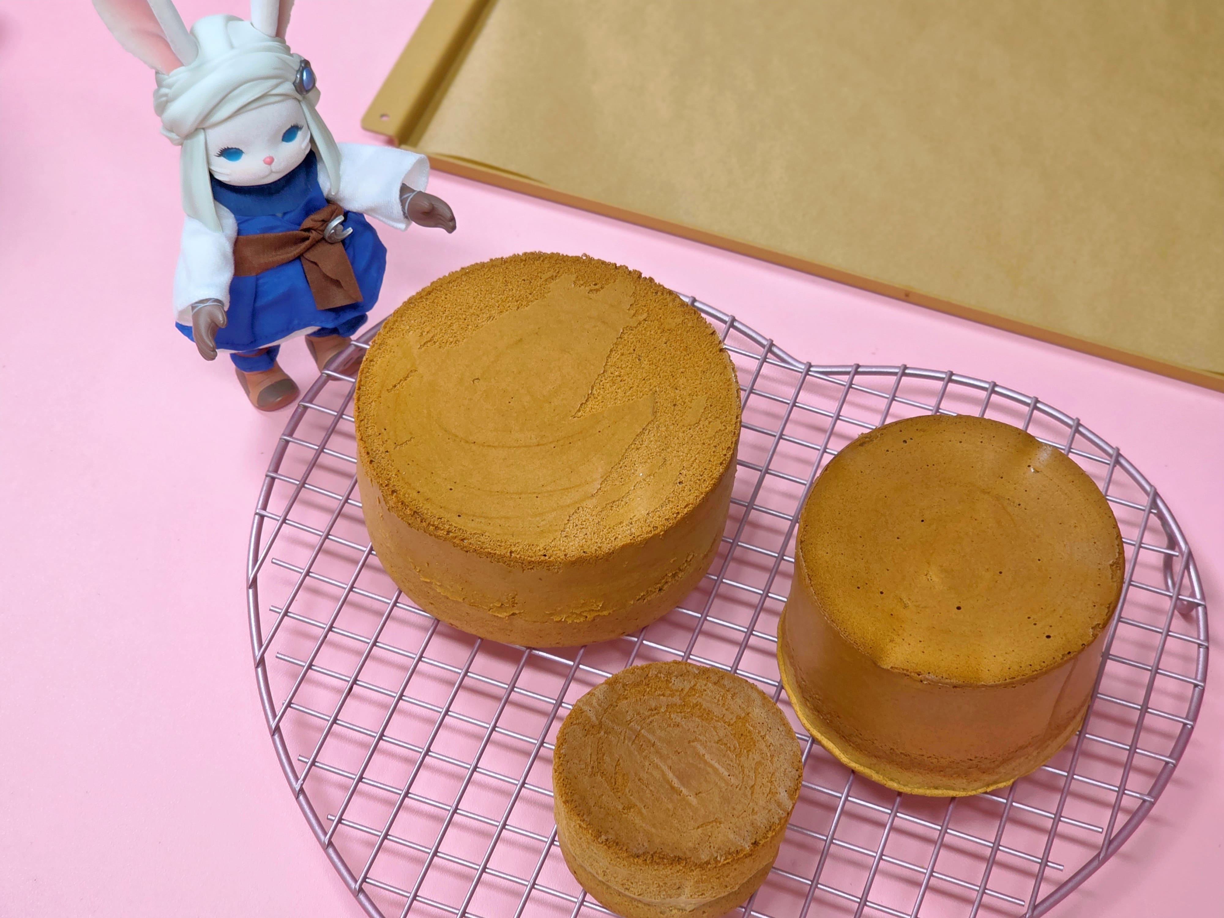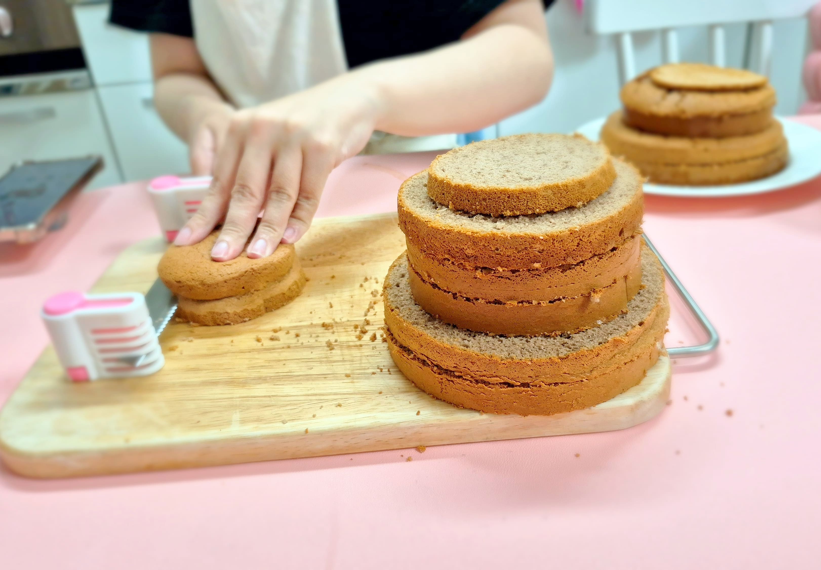 케이크의 본체는 3단이고 맨 아래에 깔리는 시트는 다른 시트보다 납작하기 때문에 슬라이스 후 두 장만 사용했습니다.