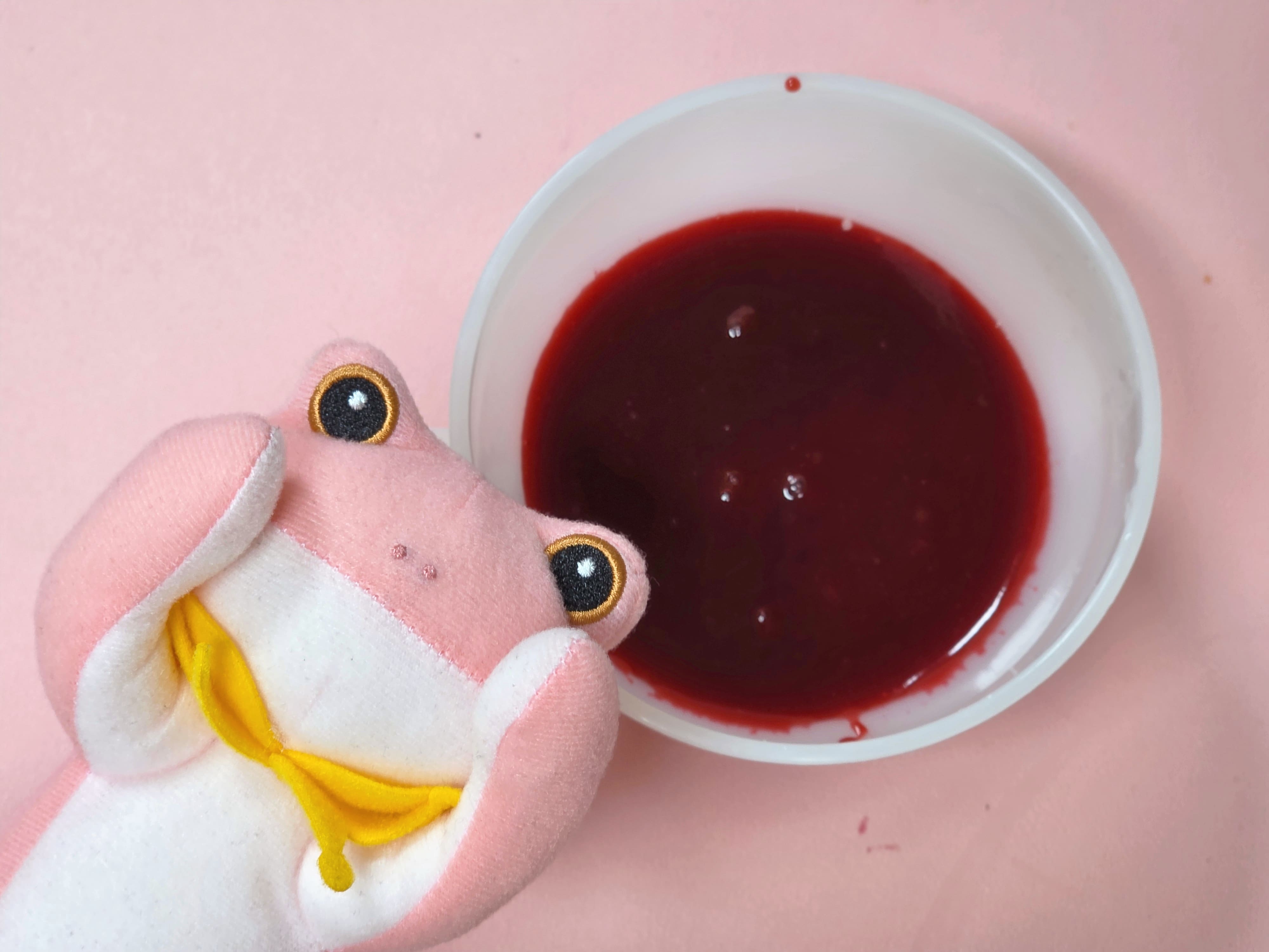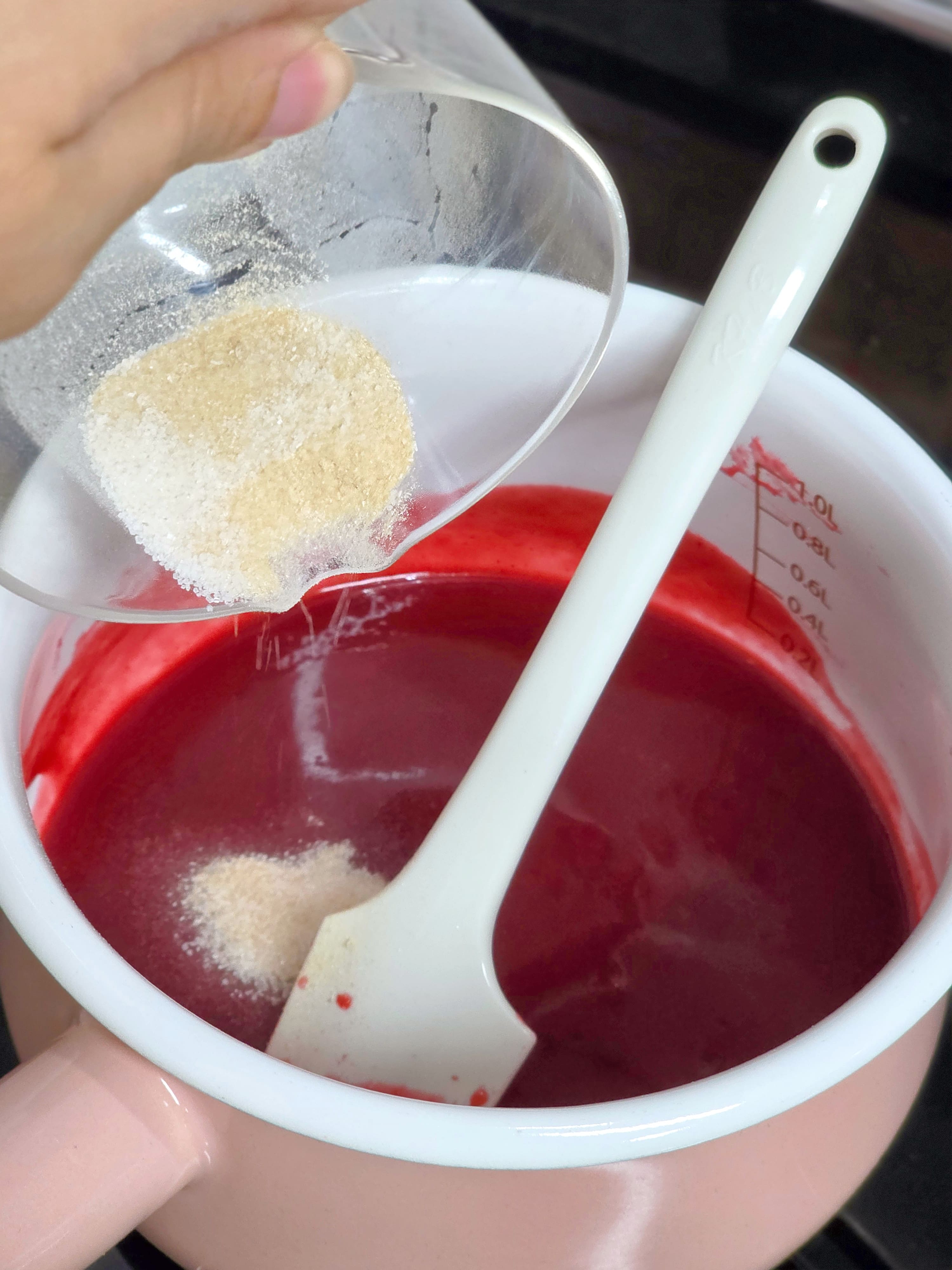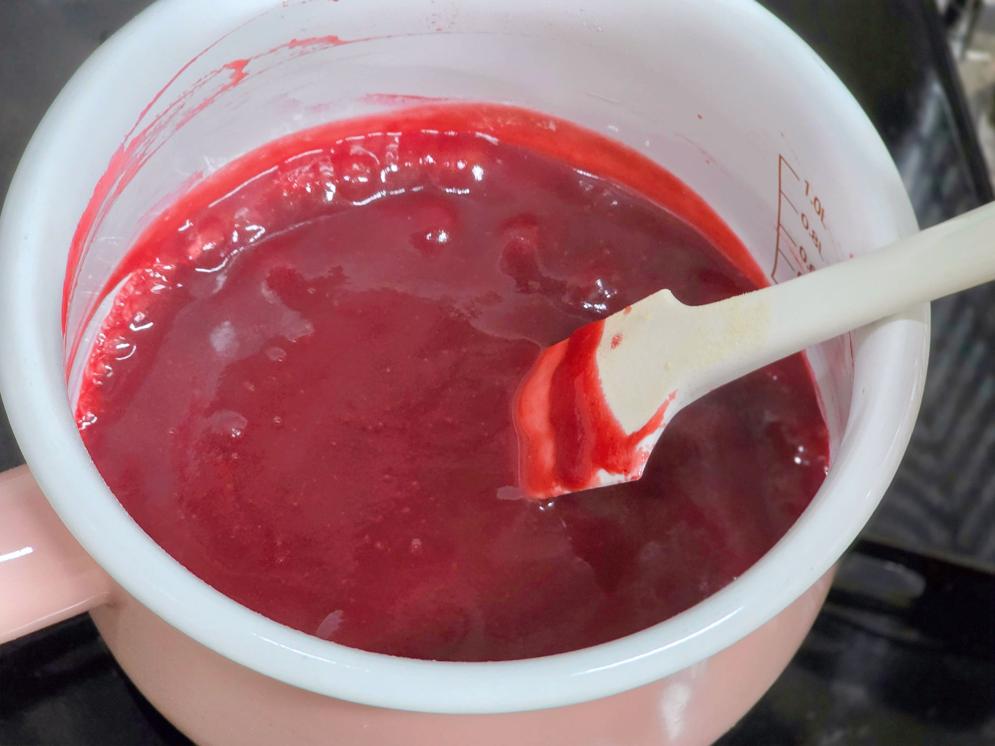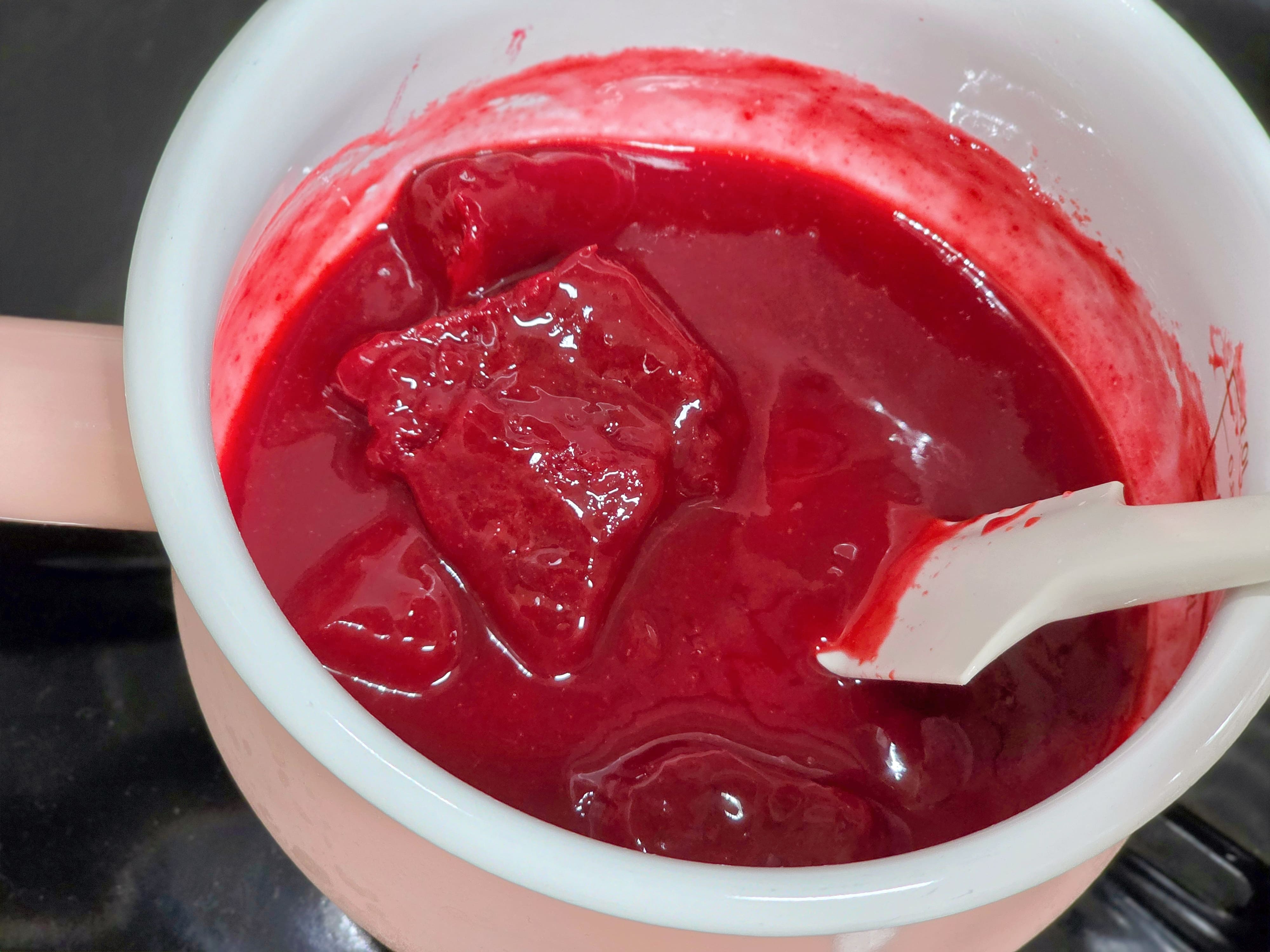 냉동 라즈베리 퓨레를 물엿과 함께 얼어 있는 덩어리가 없어질 때까지만 약불에 가열해줍니다.