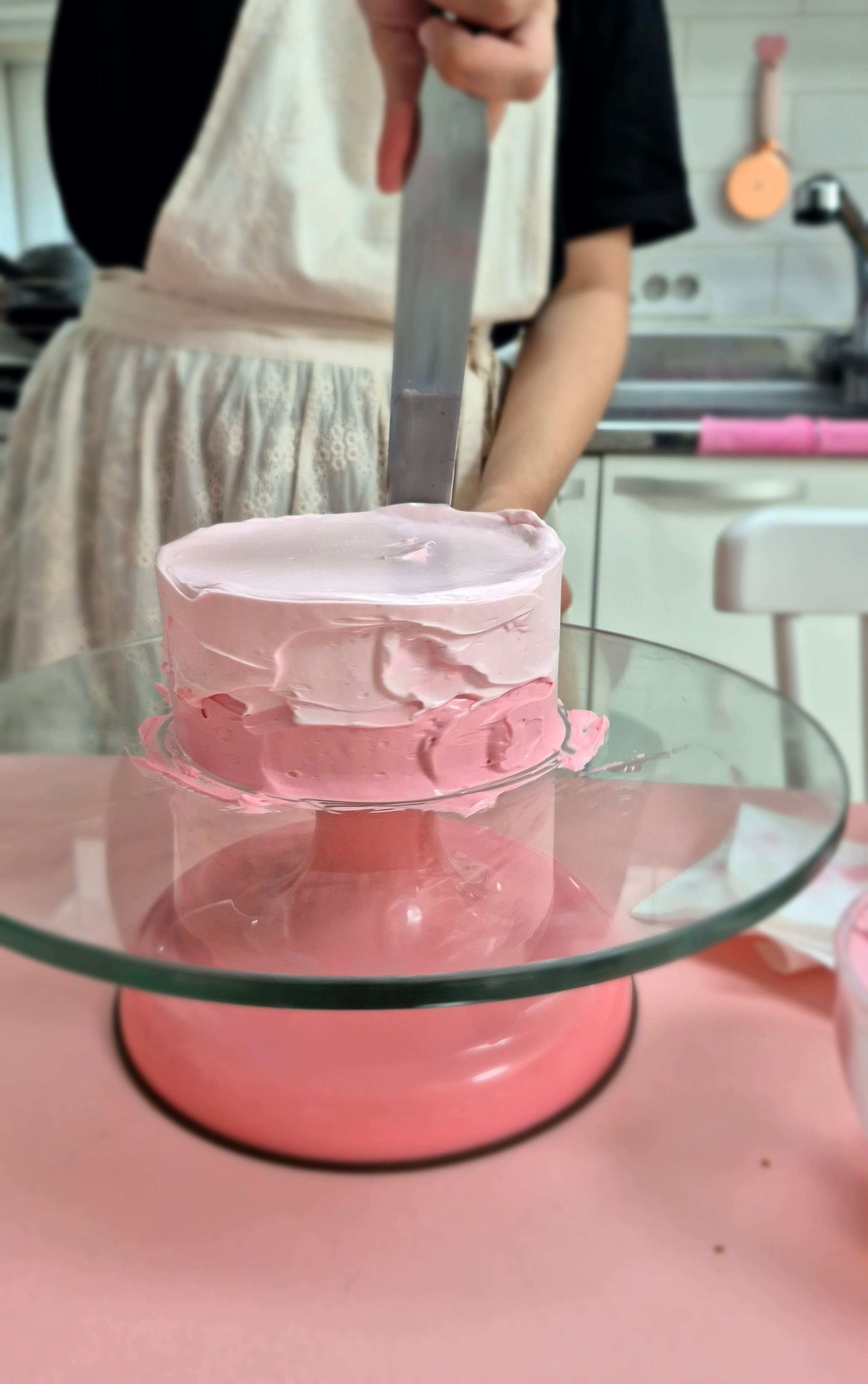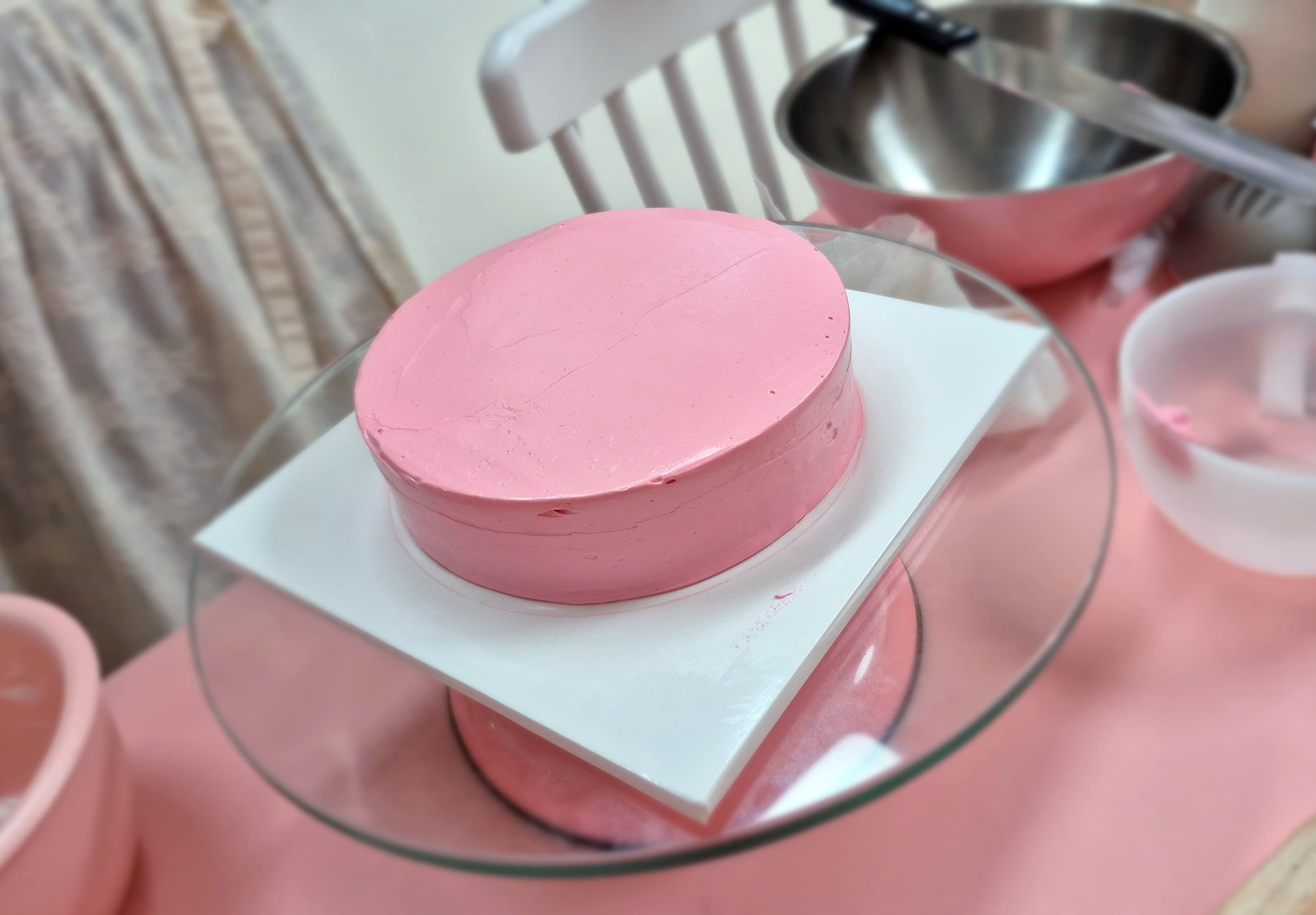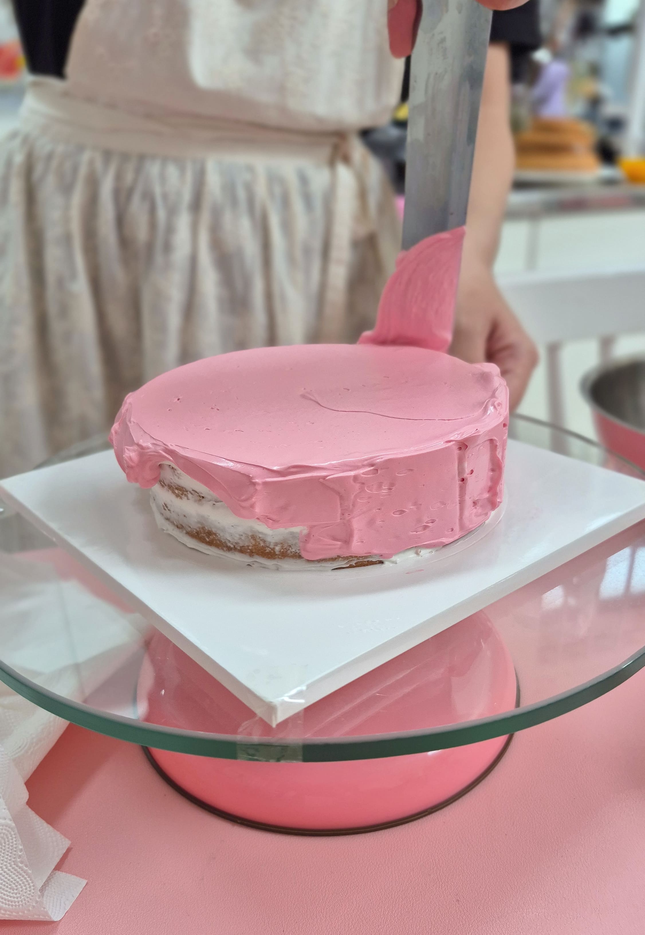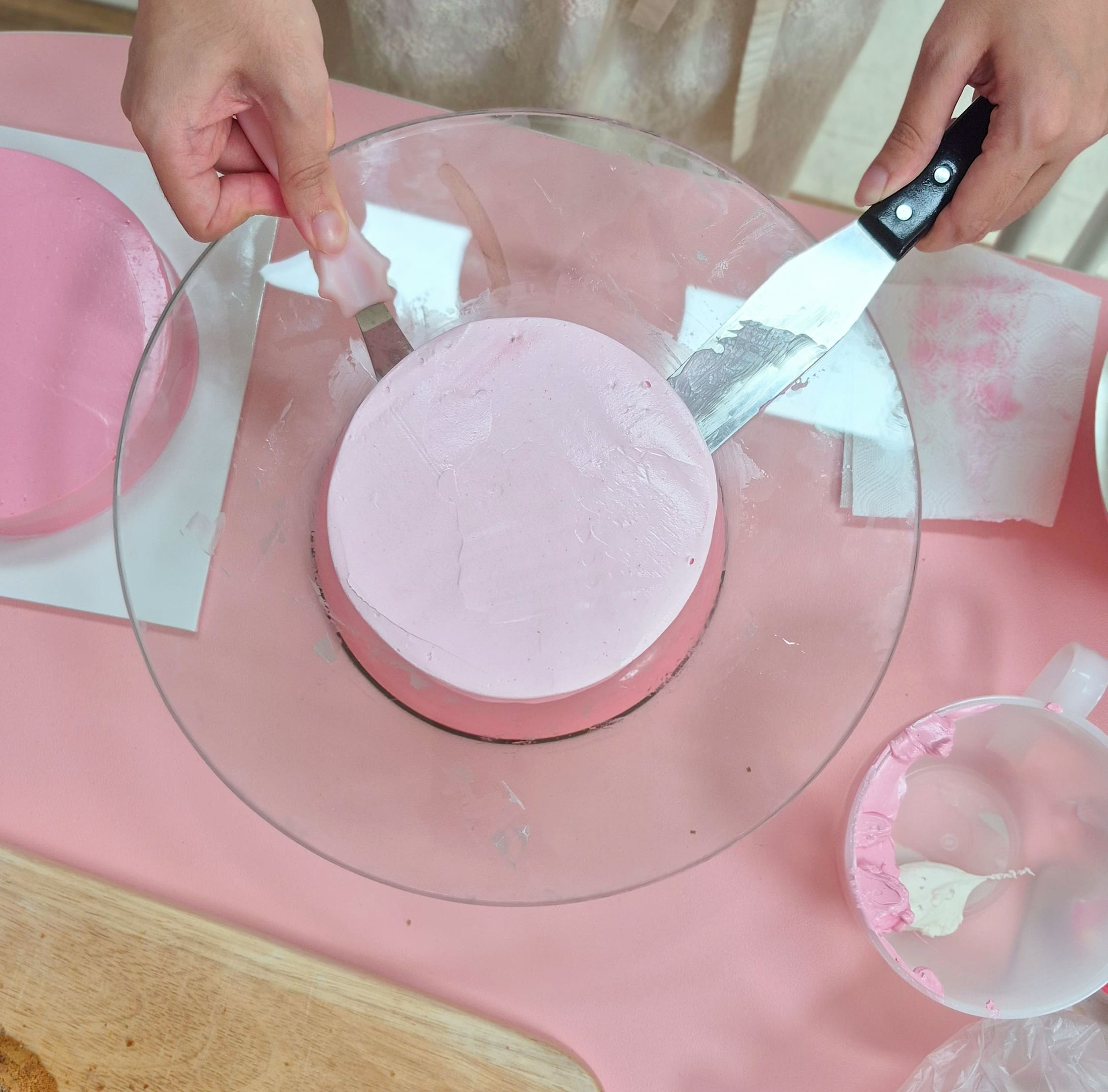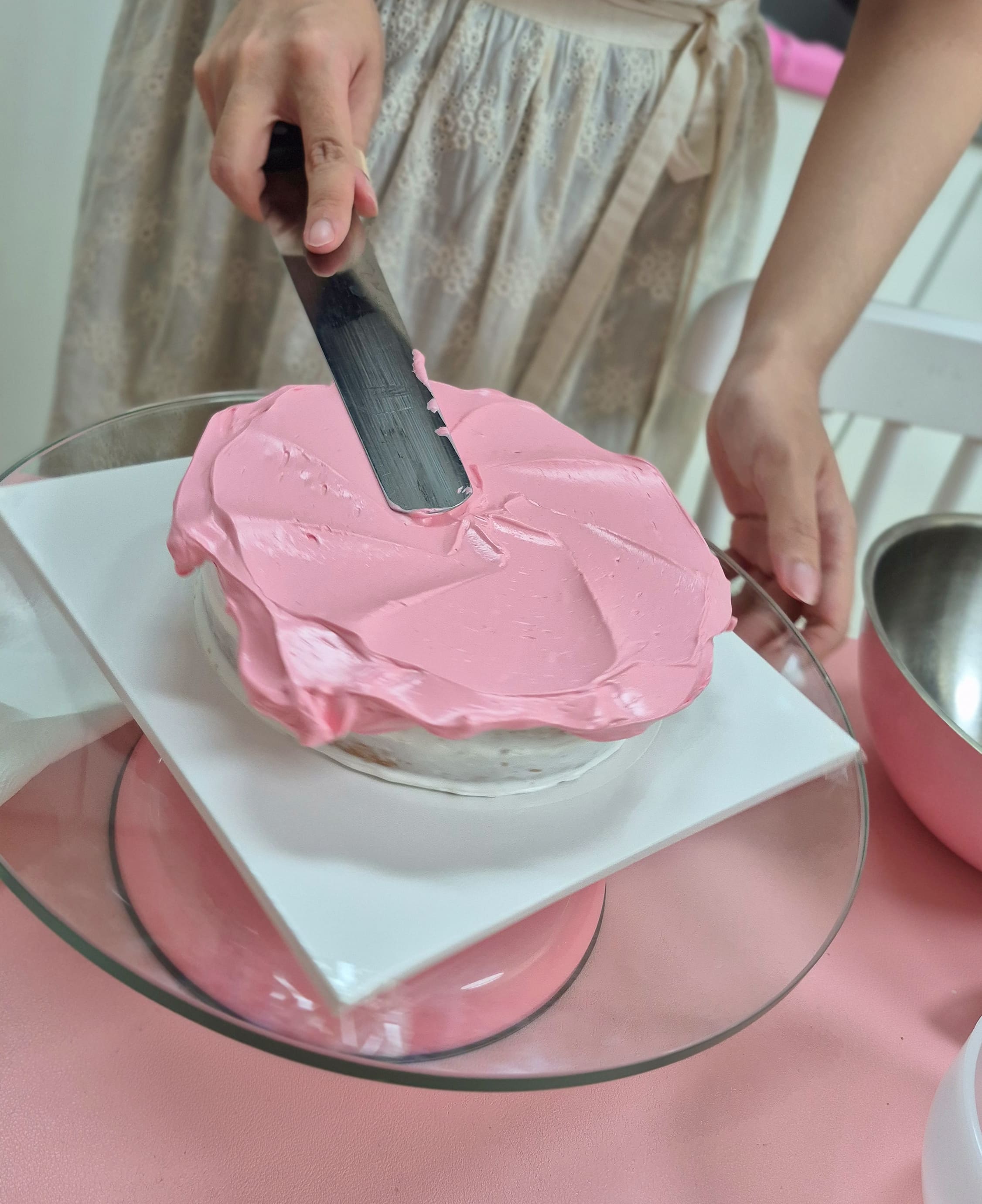 조색 해둔 로즈색 크림으로 본 아이싱을 해줍니다.