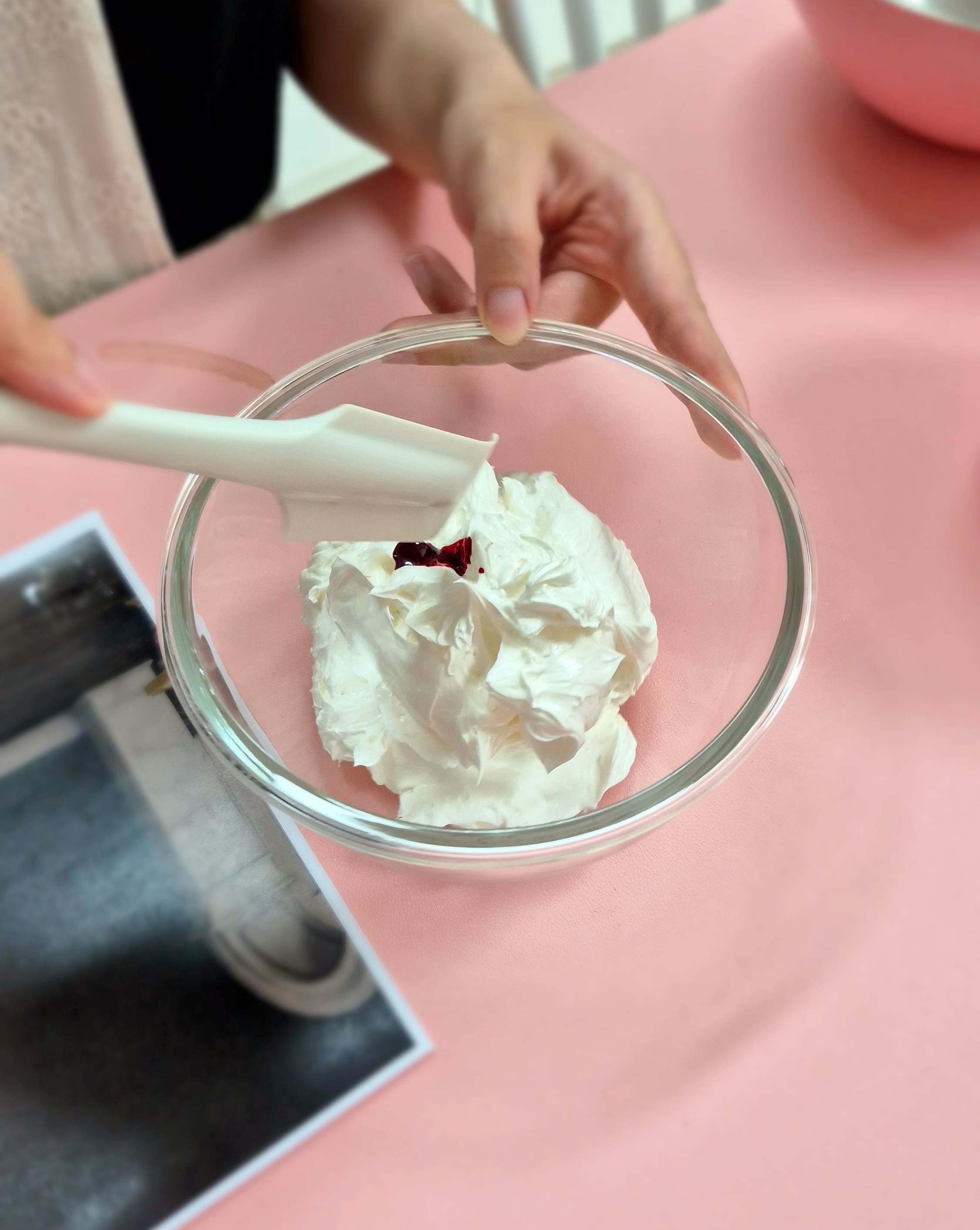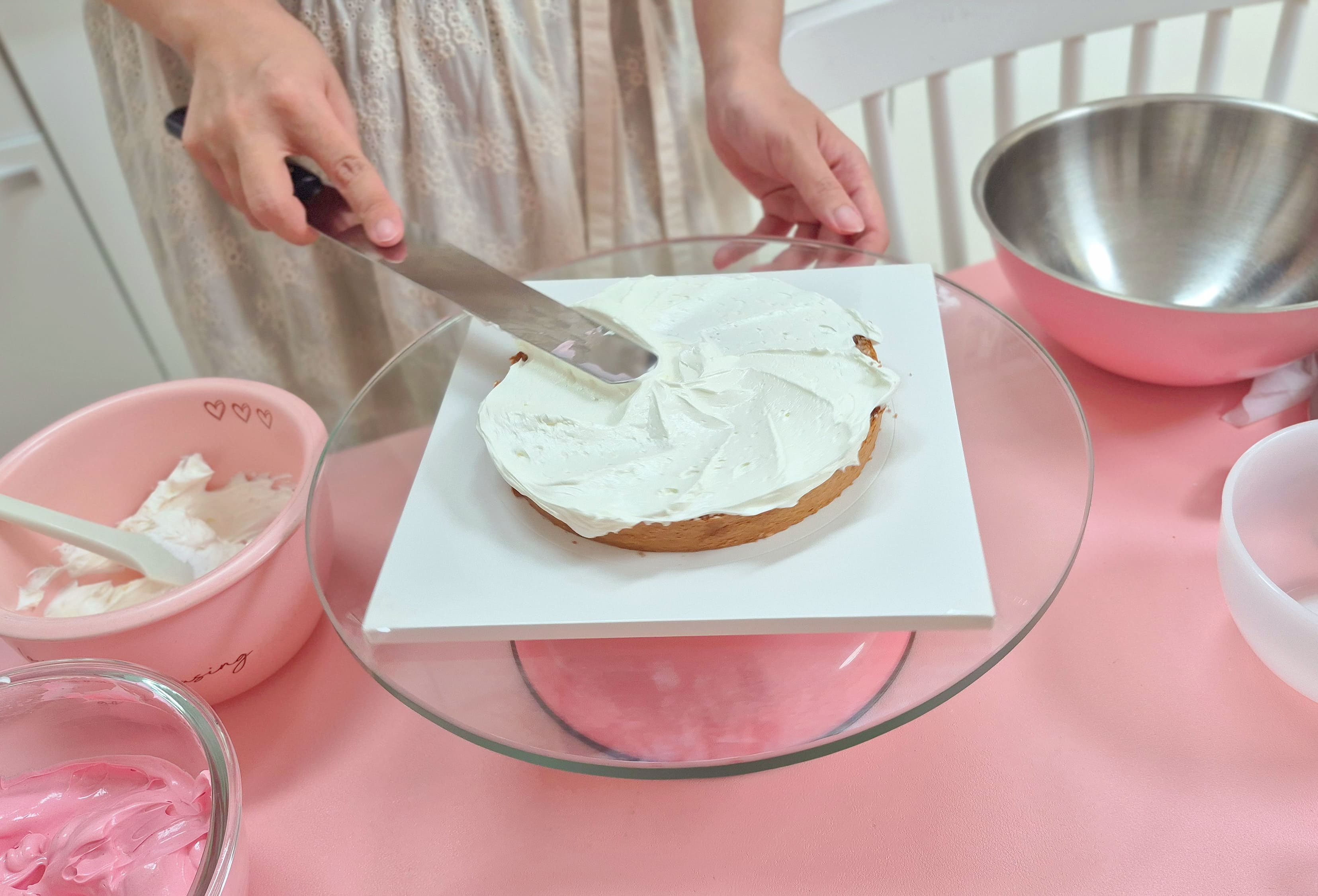 앞에서 조색 해둔 로즈 색 크림에 흰 크림을 섞어서 채도를 조금 빼준 후 시트 옆면 아래 쪽에만 크림을 발라줍니다.