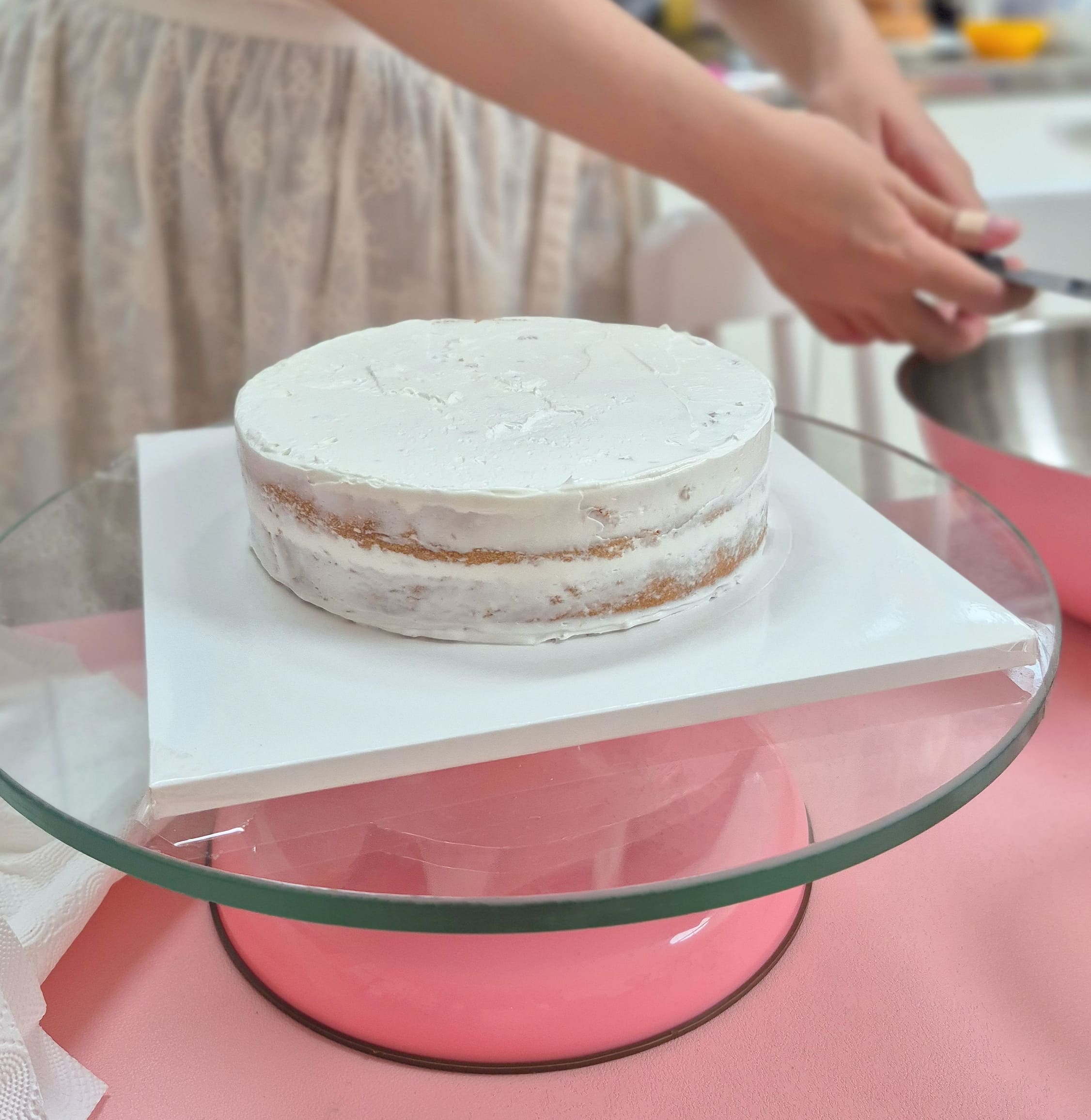 마지막으로 냉장고에서 대기 시켜 둔 1단 케이크에 조심히 케이크를 얹어 다시 냉장 보관 해줍니다!