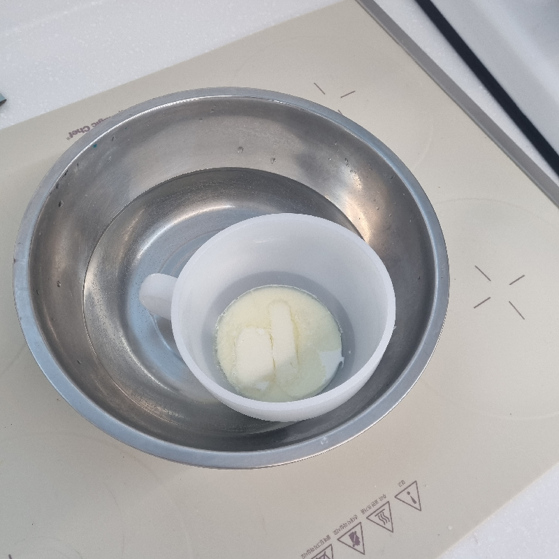 휘핑하는동안 밀가루도 체쳐두고 팬에 유산지도 깔아줍니다. 우유에 버터도 넣어서 같이 녹여줍니다.