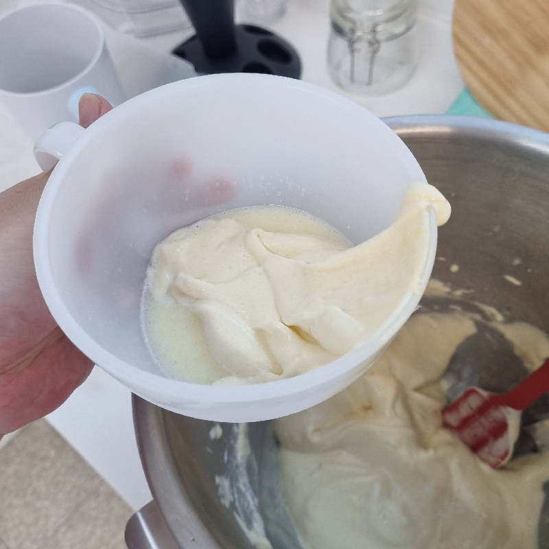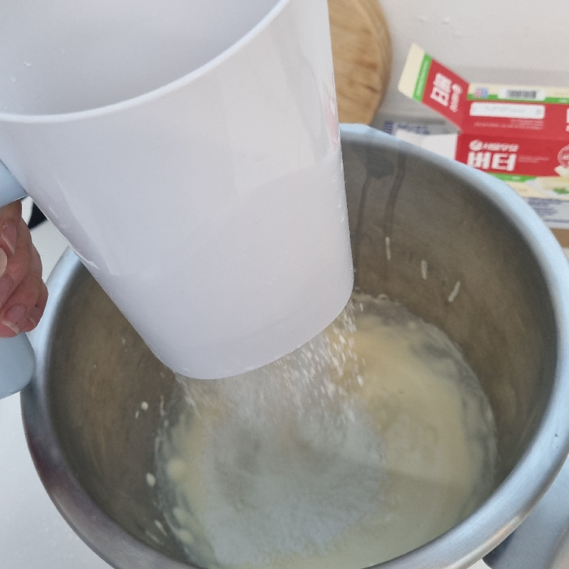 달걀, 설탕, 우유, 버터, 밀가루를 계량해주고, 계란과 설탕을 와장창 넣고 고속으로 아이보리색이 될때까지
