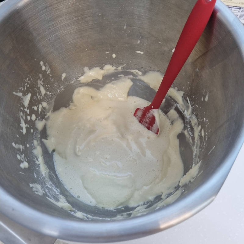 3, 이제 휘핑된 반죽에 밀가루를 넣고 빠르게 섞어줍니다.