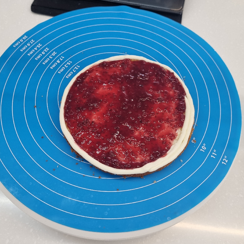 7, 미리 휘핑해놓은 크림을 가지고와 케이크시럽을 뿌린 시트위 크림-딸기잼순으로 층층이 만들어줍니다...
