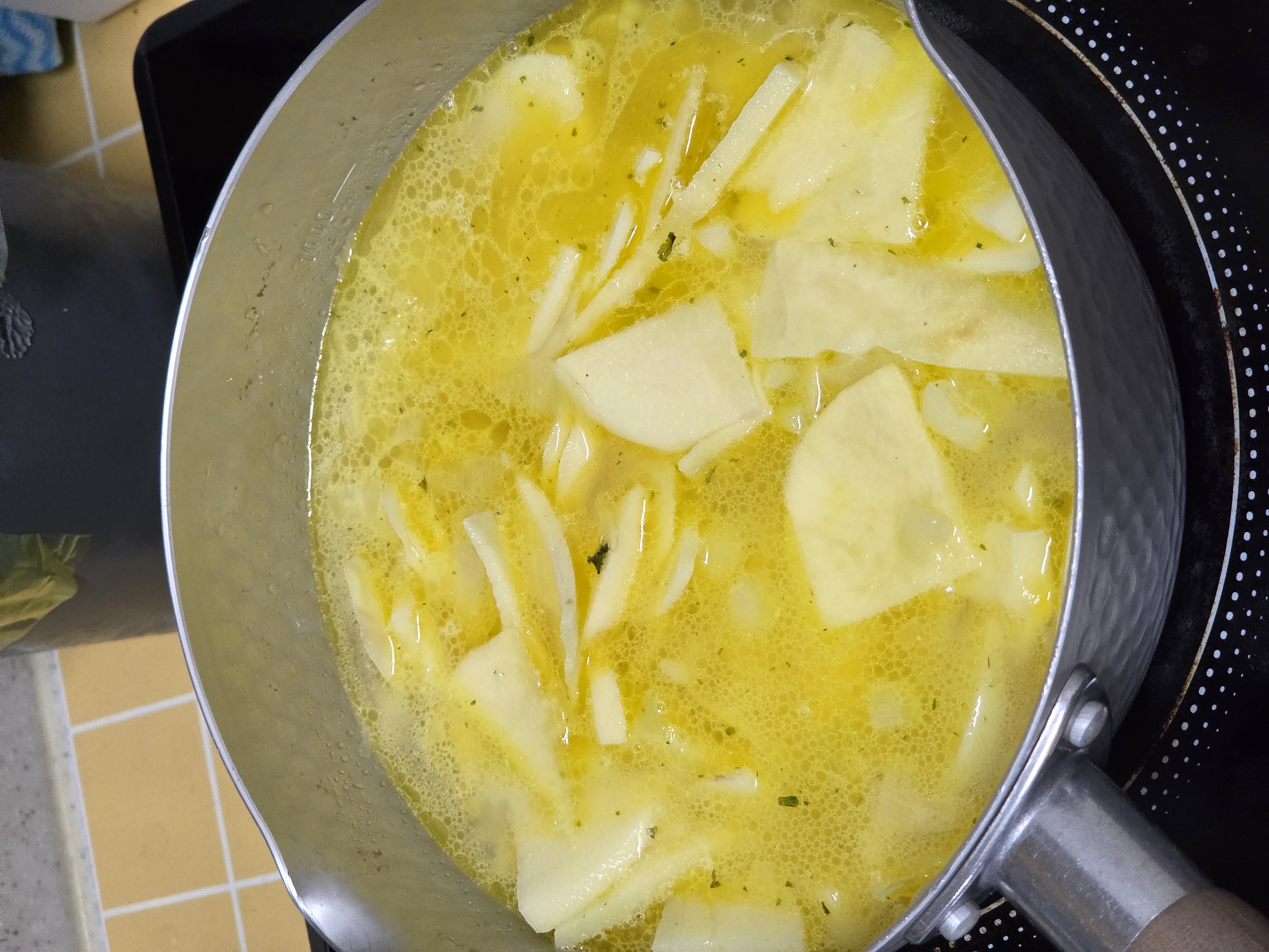 4. 양파가 투명하게 익으면 썰은 감자와 치킨스톡을 넣고 감자가 익을 때 까지 끓여줍니다.