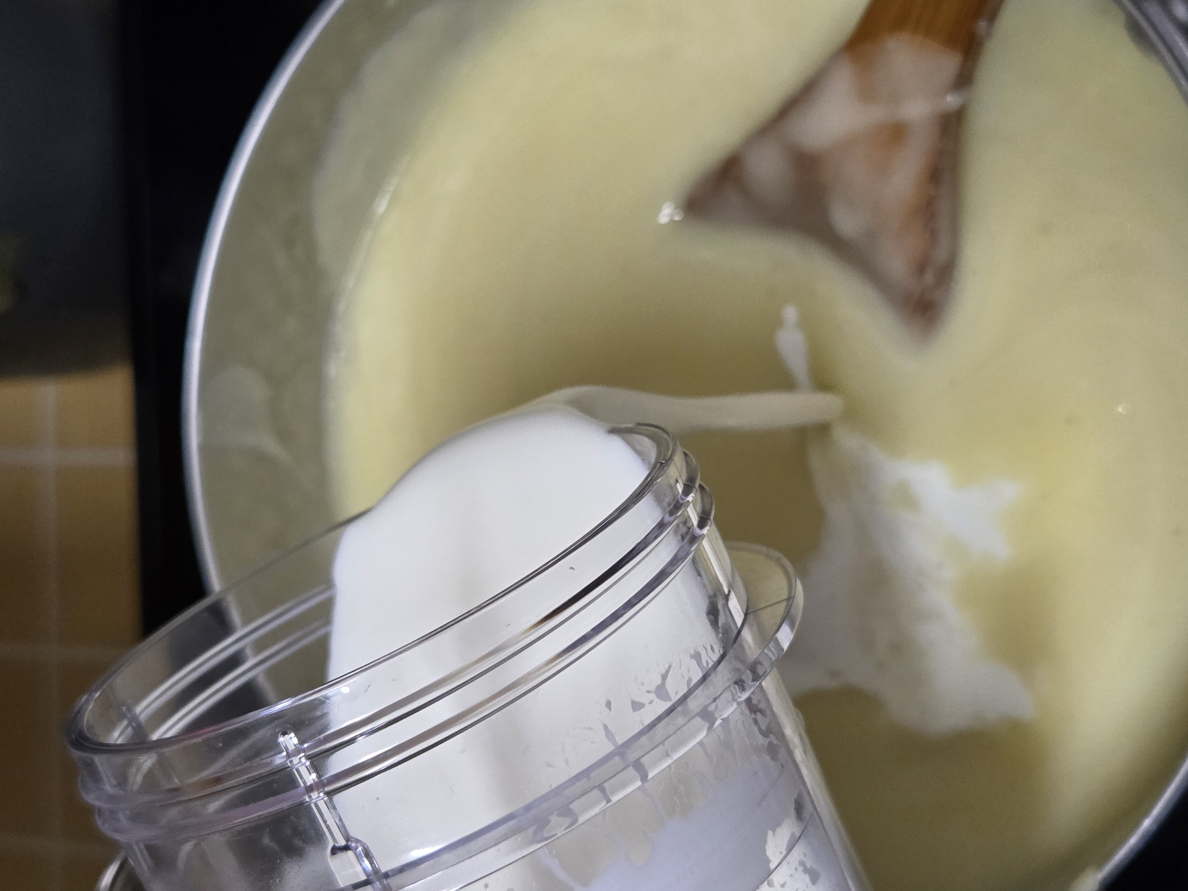 6. 믹서기로 간 재료들을 다시 냄비에 넣고 생크림을 섞어가며 약불에서 끓여줍니다. 우유로 대체해도 되지만 생크림으로 해야 더 풍미가 있어요