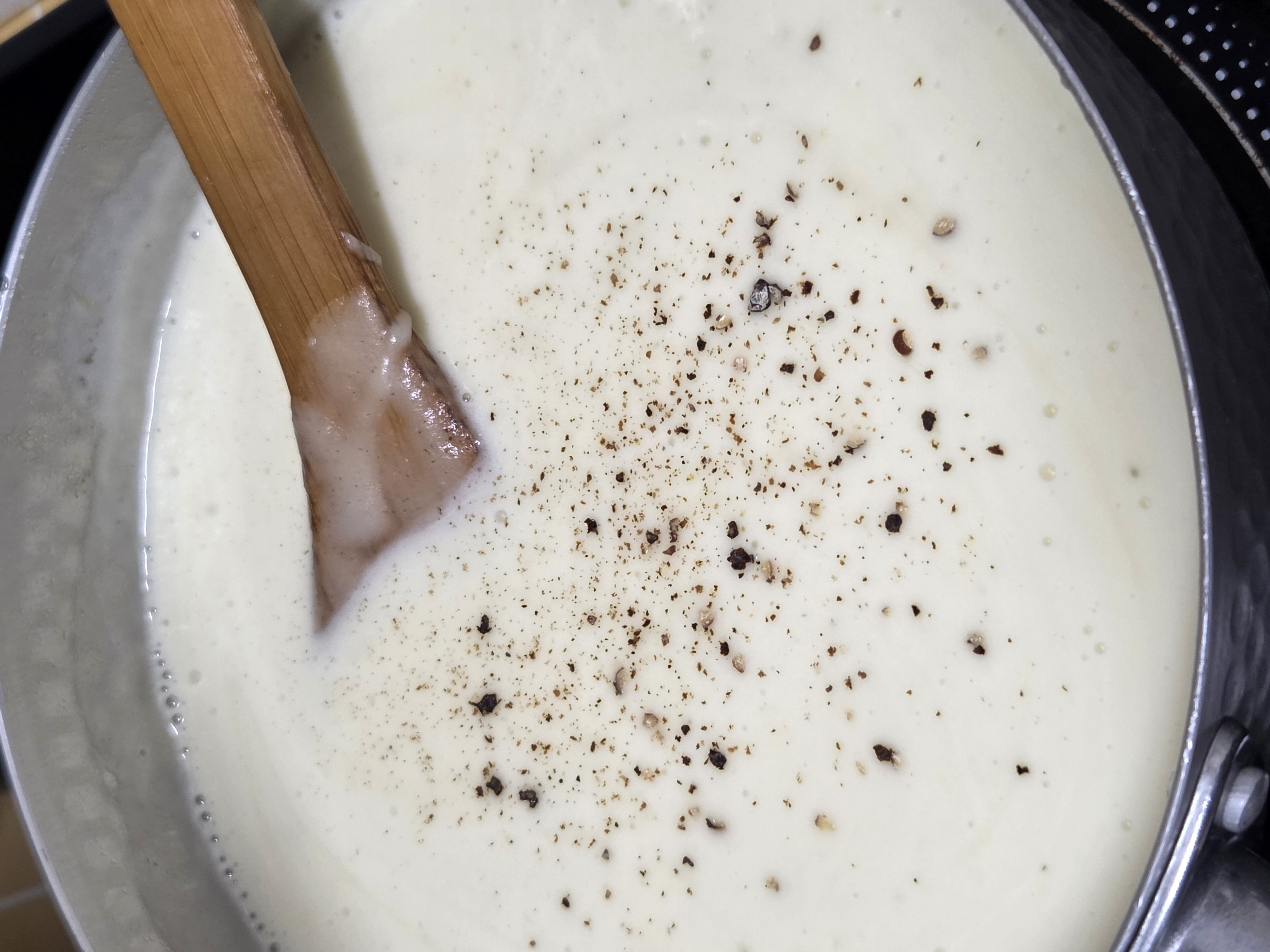 7. 끓이면서 소금과 후추로 간을 맞춰주면 되는데 치킨스톡으로 짠맛이 충분해져서 저는 후추만 넣었습니다. 혹시라도 저를 따라하시다 두 스푼을 넣게 되시면 소금은 넣지 마세요..
