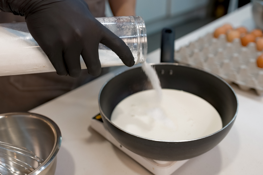 6. 식혀둔 크렘브륄레위에 설탕을 얇게 뿌려준뒤 파이쟈를 시전해 설탕을 태워줍니다