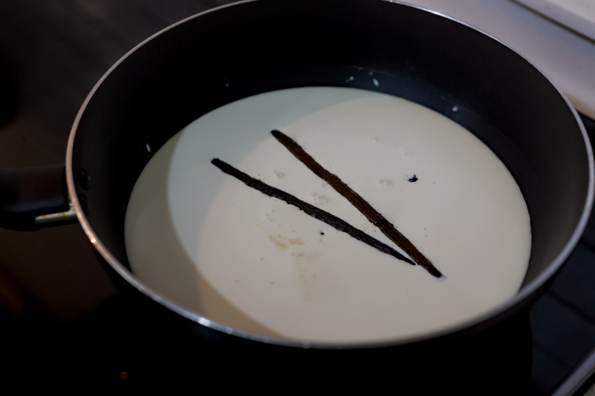 2. 냄비에 바닐라빈 생크림 우유 남은설탕을 모두 넣고 가장자리 끓을때까지 데워줍니다