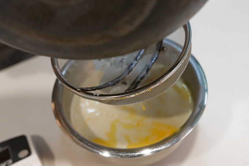 3. 노른자 혼합물에 바닐라우유를 섞어준뒤 체에걸러서 내열용기에 담아줍니다