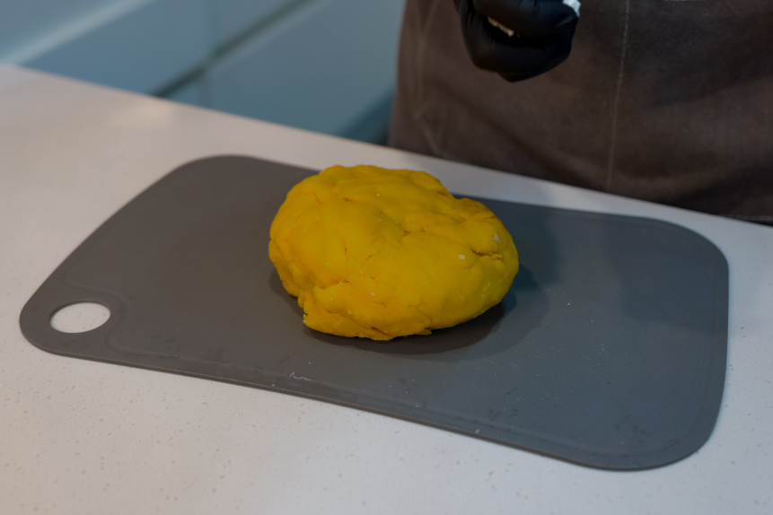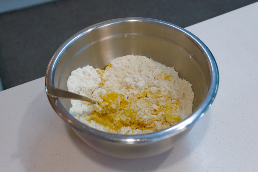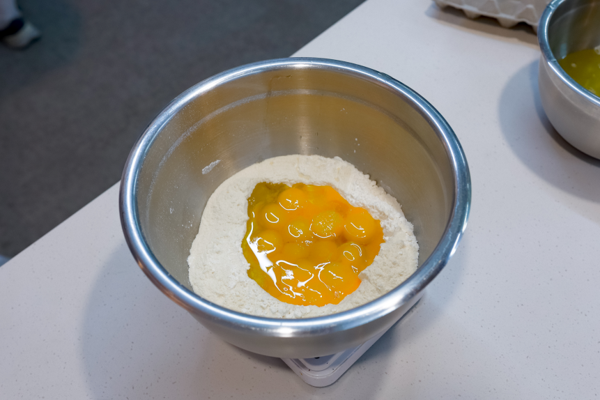 1. 강력분에 듀럼밀가루, 노른자, 소금약간, 올리브유를 넣고 빡빡 치대서 한덩어리로 만들어줍니다