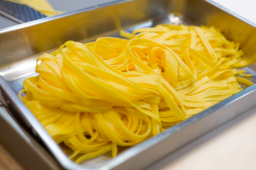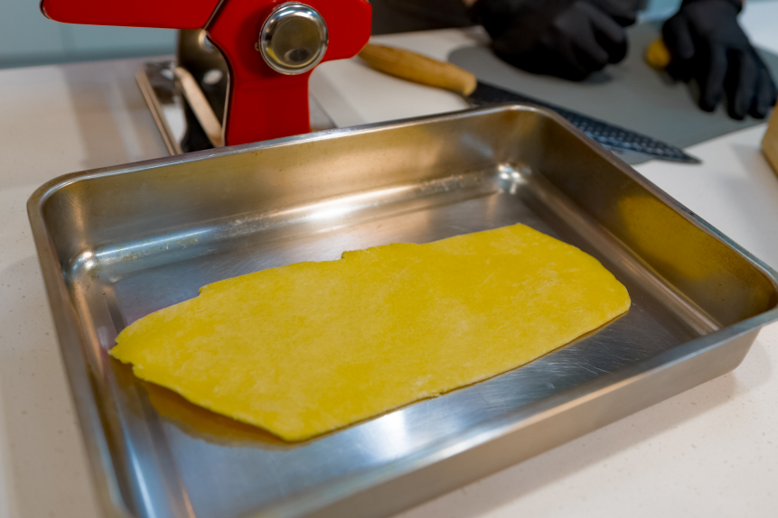 2. 만들어진 반죽을 1시간정도 상온숙성시킨뒤 8등분해 파스타머신으로 얇게 밀어서 잘라줍니다