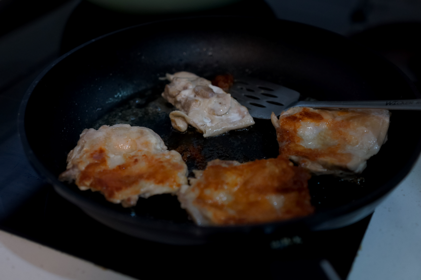 1. 양파와 마늘을 '난도질'해준뒤 토종닭 다리살은 팬에서 껍질부터 바삭하게 구워줍니다