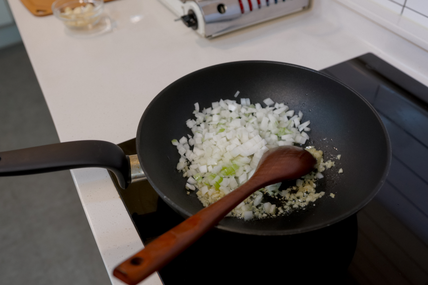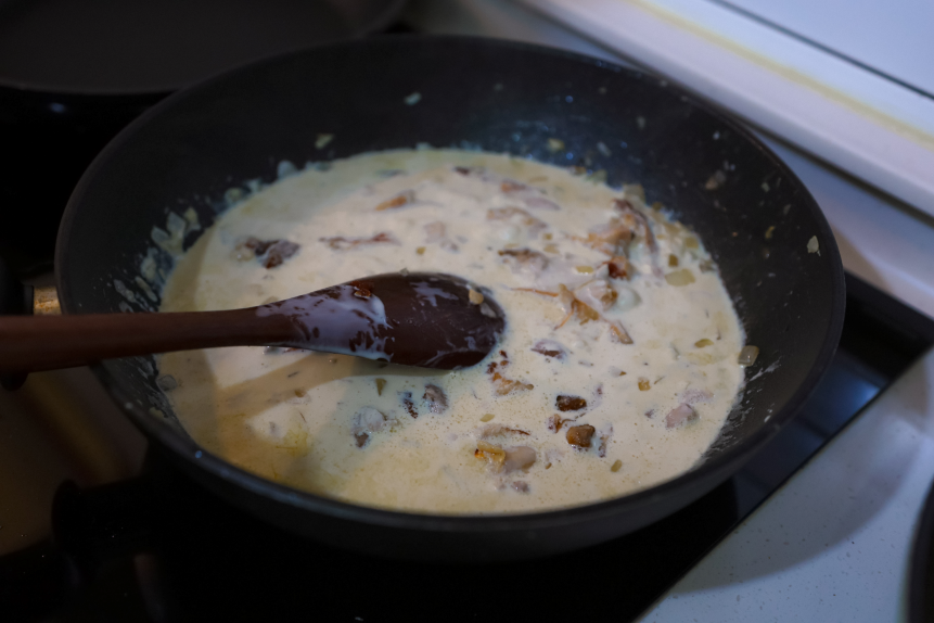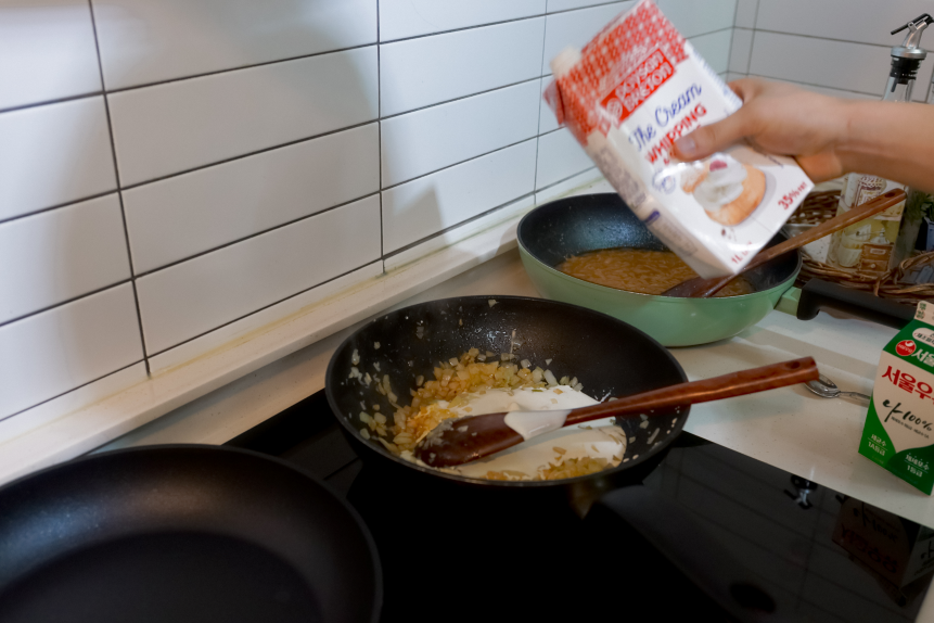 2. 프란토이오 기름을 두른팬에 양파와 마늘을 볶아준다음 크림과 우유를 넣고 끓여줍니다