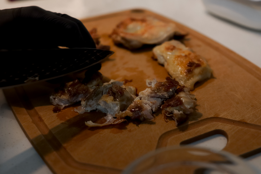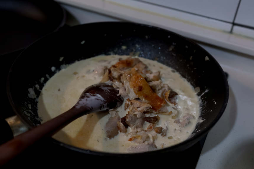 3. 구워진 닭다리살은 먹기좋게 잘라서 크림소스에 넣어서 섞어줍니다