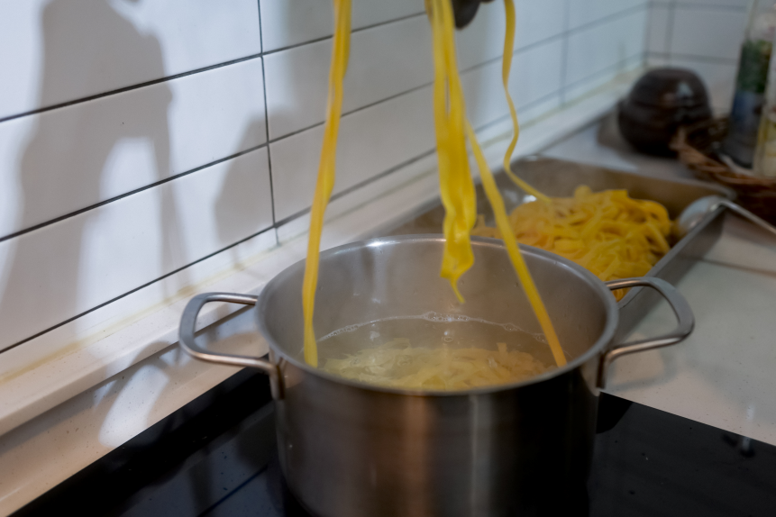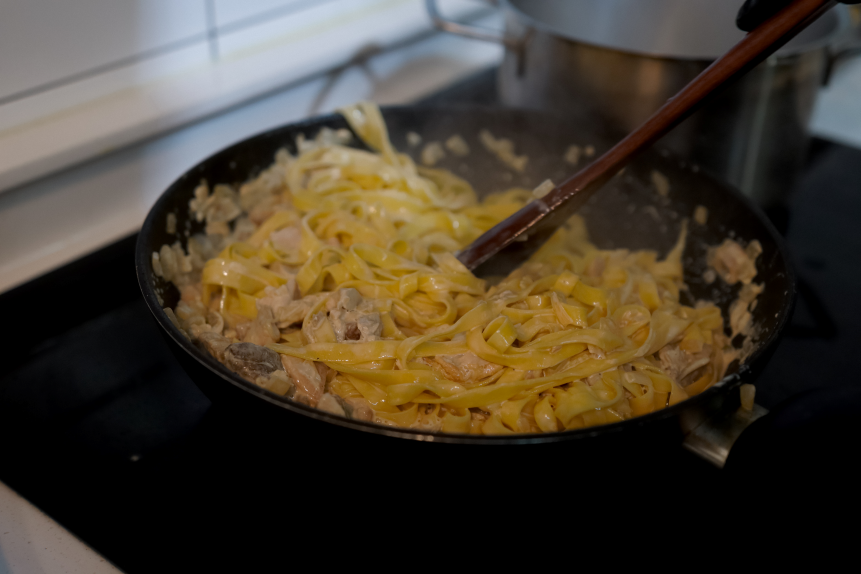 4. 만들어둔 면을 삶아서 크림소스와 버무려줍니다