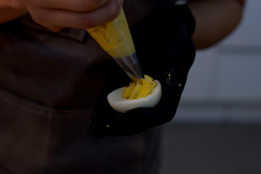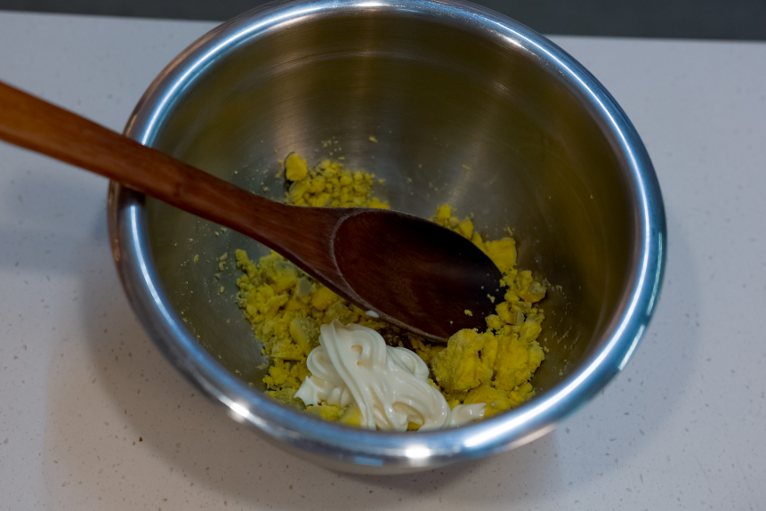 3. 분리한 노른자를 볼에 담고 보름정어리,곱슬파슬리,알라미고겨자,꼬마레몬즙,파프리카가루를 모두 섞어 필링을만들어줍니다