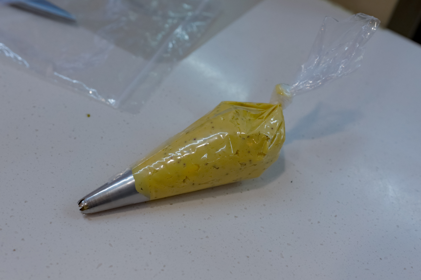 4. 짤주머니에 필링을 담아준뒤 흰자에 예쁘게 짜줍니다