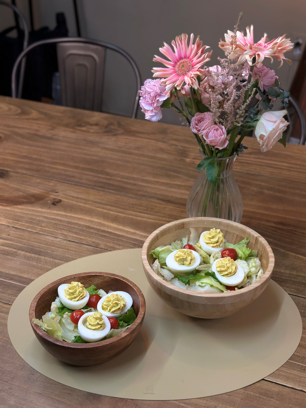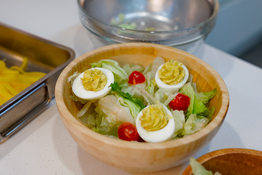 5. 야채는 물기를 제거한뒤 보울에 담고 데빌드에그를 올려서 장식합니다
