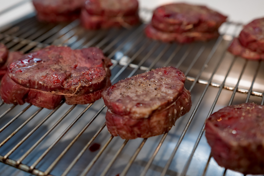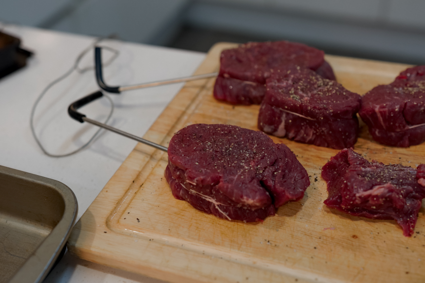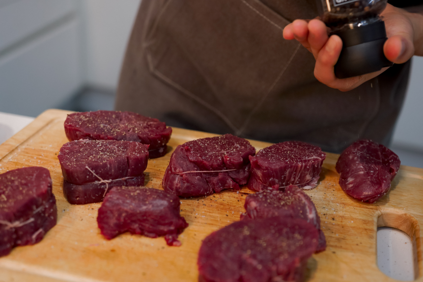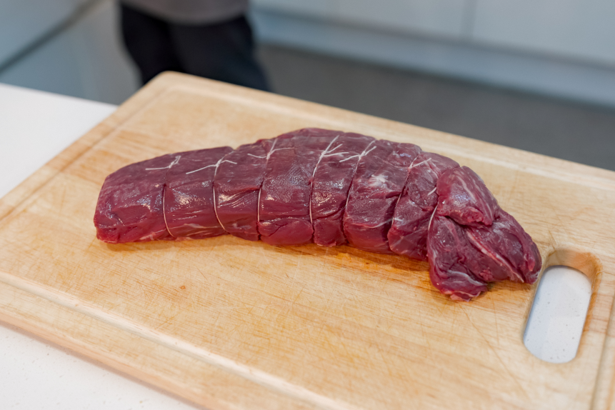 1. 로네크 안심은 흐트러지지않게 실로 묶어준다음 3센치 두께로 잘라줍니다