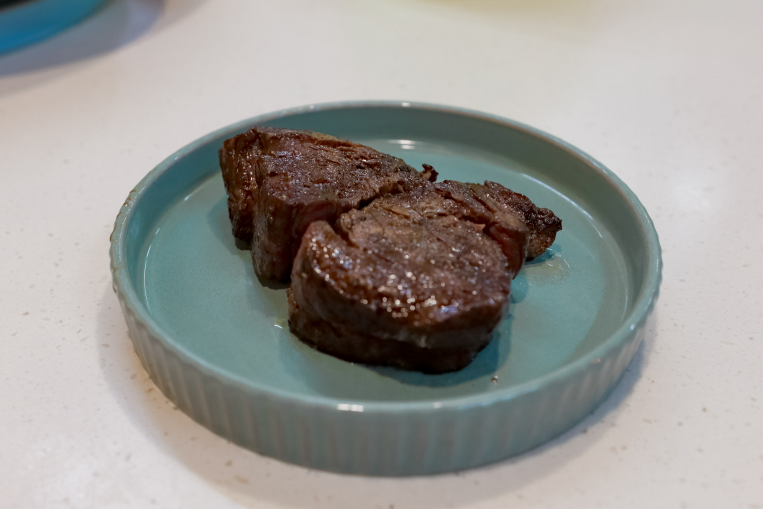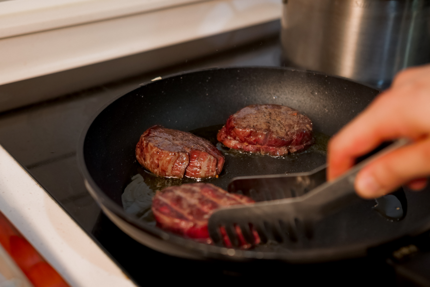4. 안심의 심부온도가 50도가 되면 꺼내서 투랄옥수수유와 야술라니마늘을 넣은 팬에 빠르게 익혀줍니다