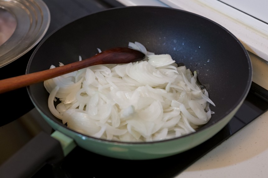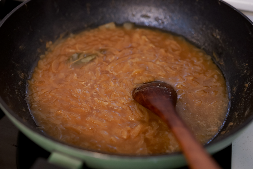 2. 채쳐준 외계양파를 억겁의 시간동안 볶아서 갈색이 돌때까지 볶아서 카라멜라이징해줍니다