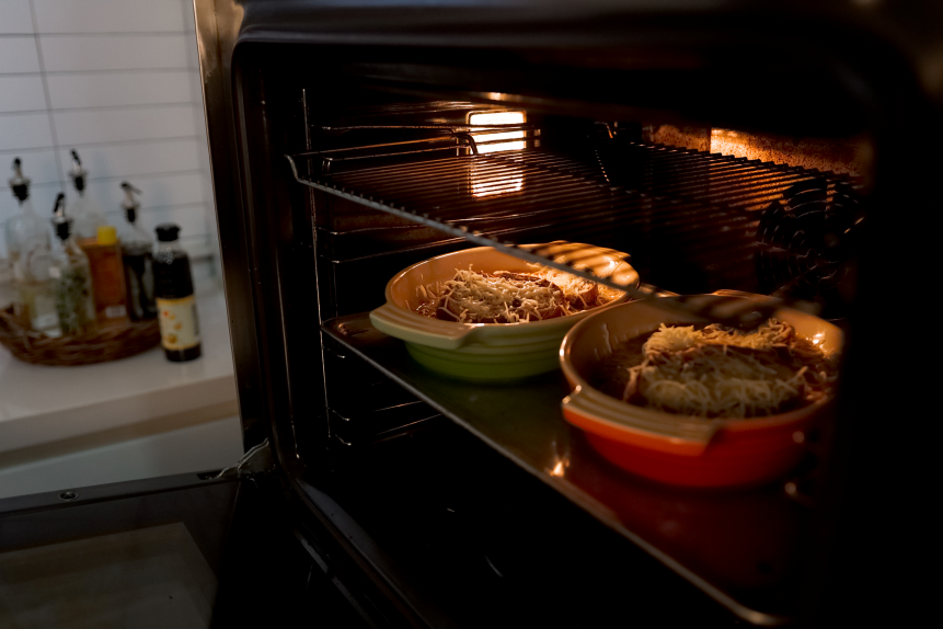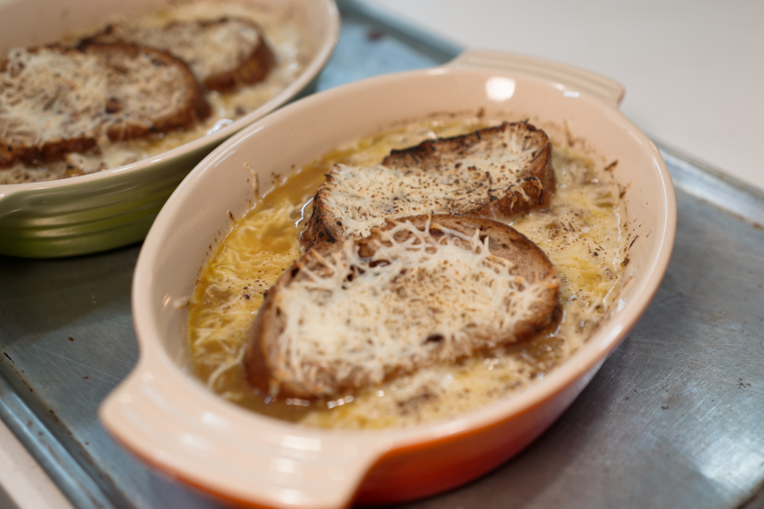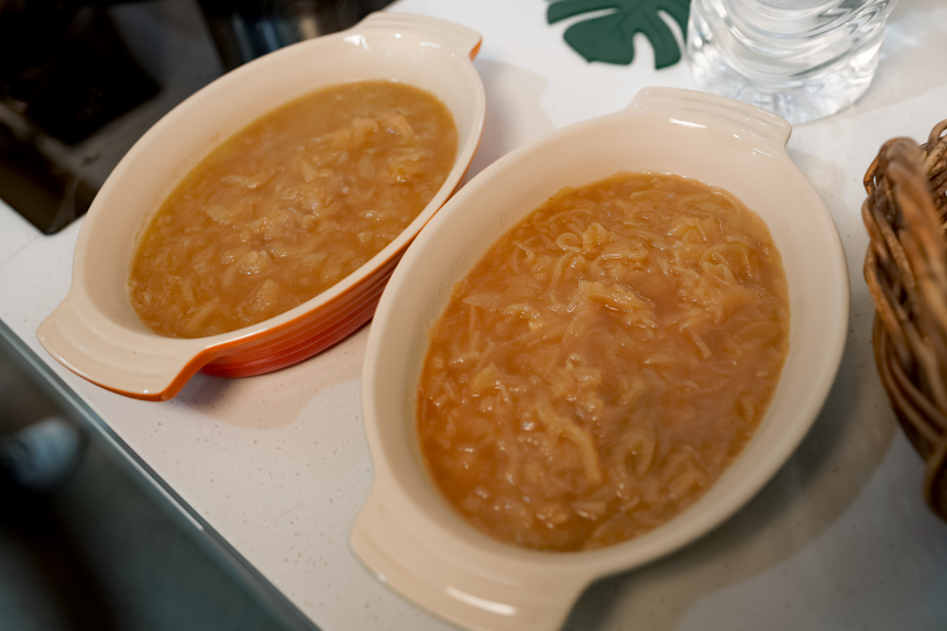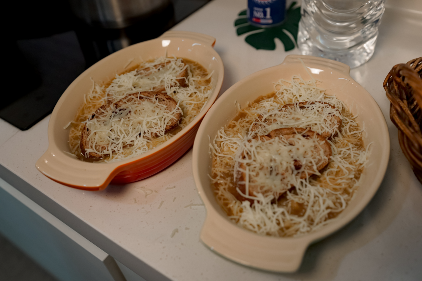 4. 그라탱용기에 외계양파수프를 담아준뒤 빵과 갈레안치즈를 얹어 치즈가 녹을때까지 오븐에서 구워줍니다