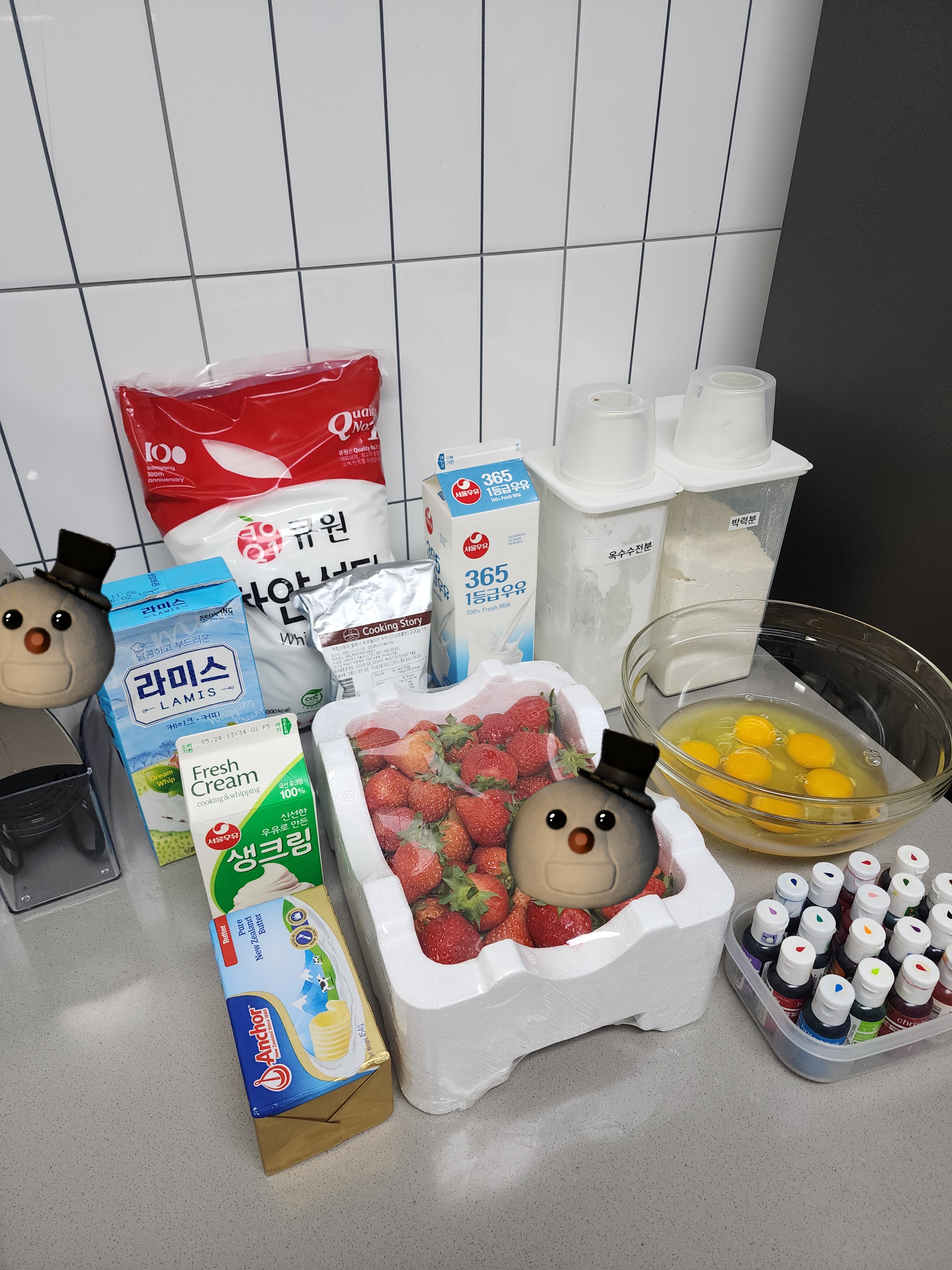 1단은 초코크림, 2단은 그냥 크림으로 하고.. 외부의 장식들도 기본 크림으로 할 예정입니다!