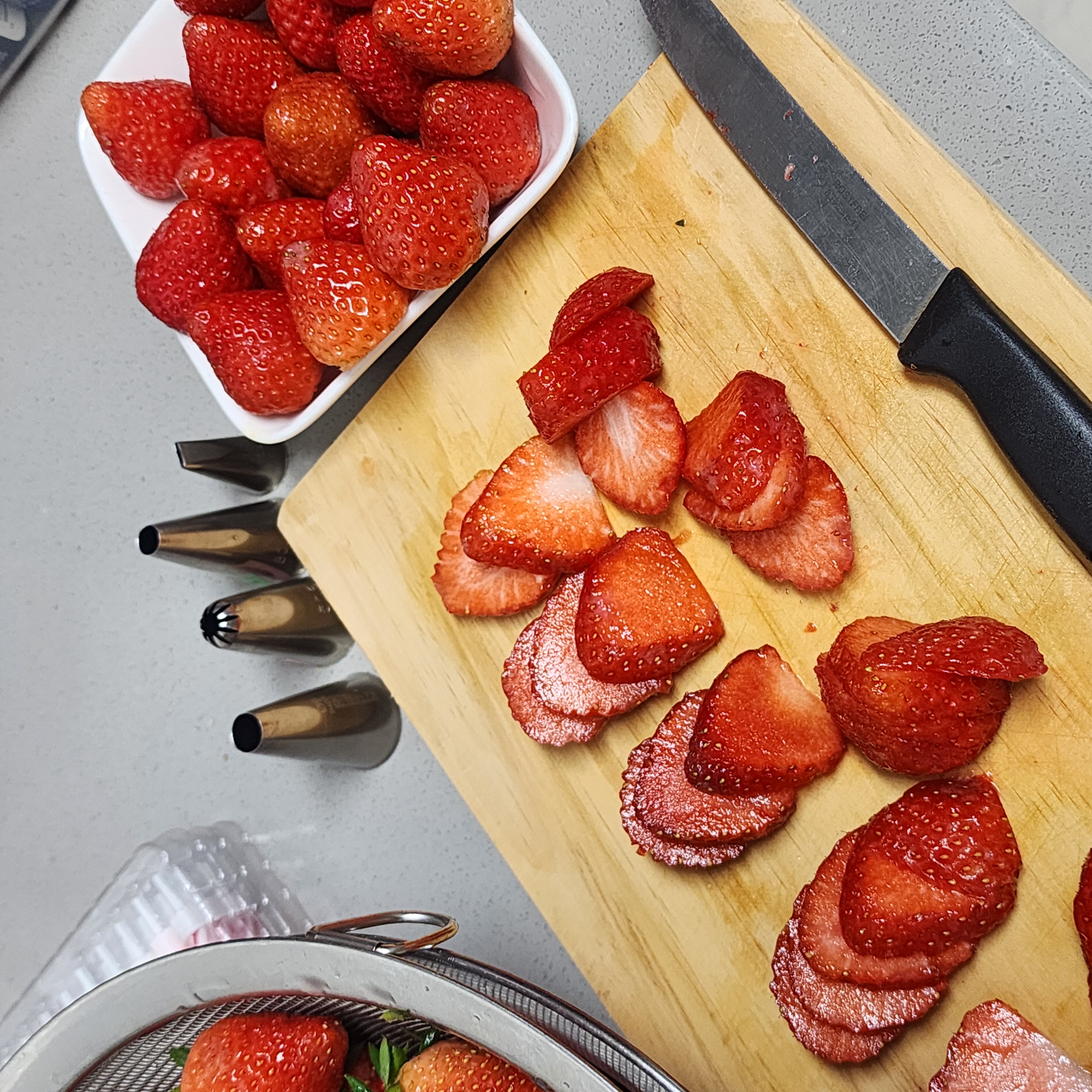 케이크 외부에 올릴 예쁜 통 복실딸기를 제외한 나머지는 잘라줍니다.