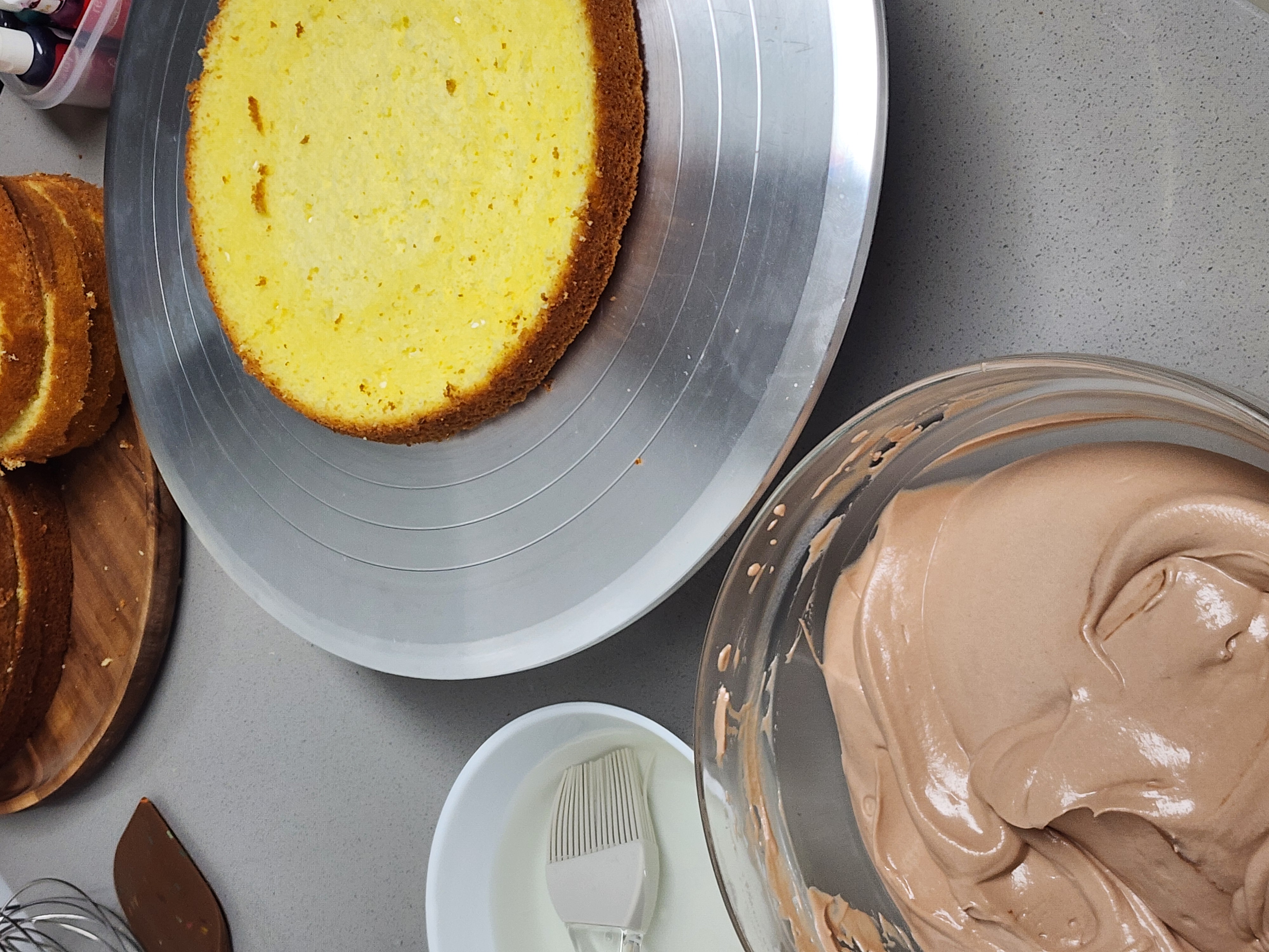 자른 제누와즈 한장을 돌림판에 올린 후 만들어 둔 시럽을 촉촉하게 발라줍니다.