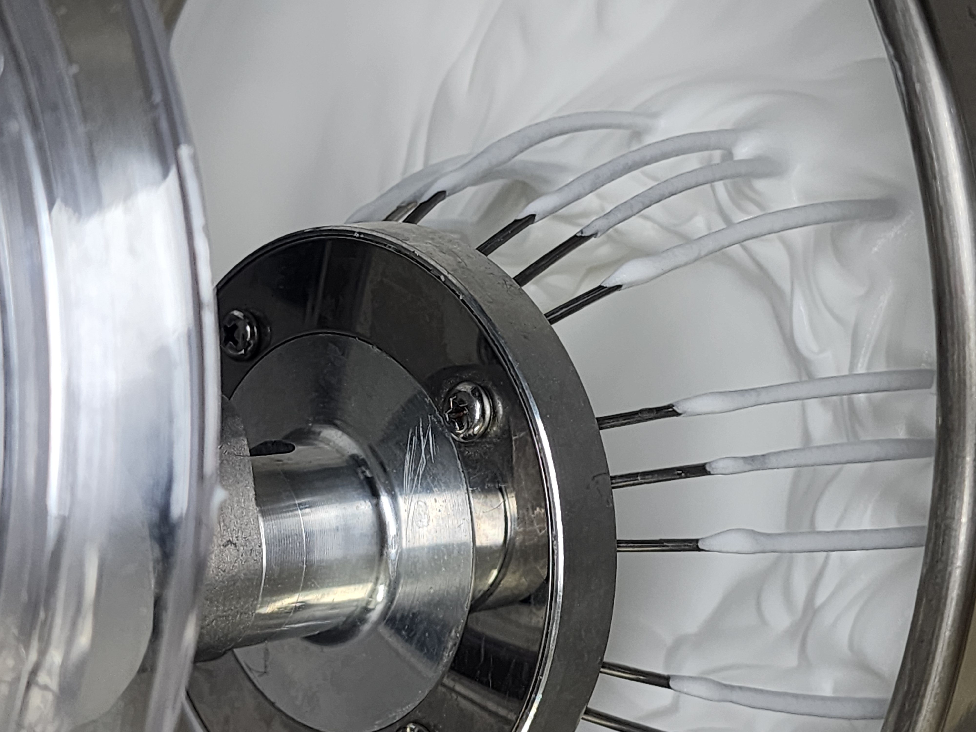 이 상태에서 핸드믹서의 저속으로 섞어 거품들을 좀 더 안정화 해줍니다.