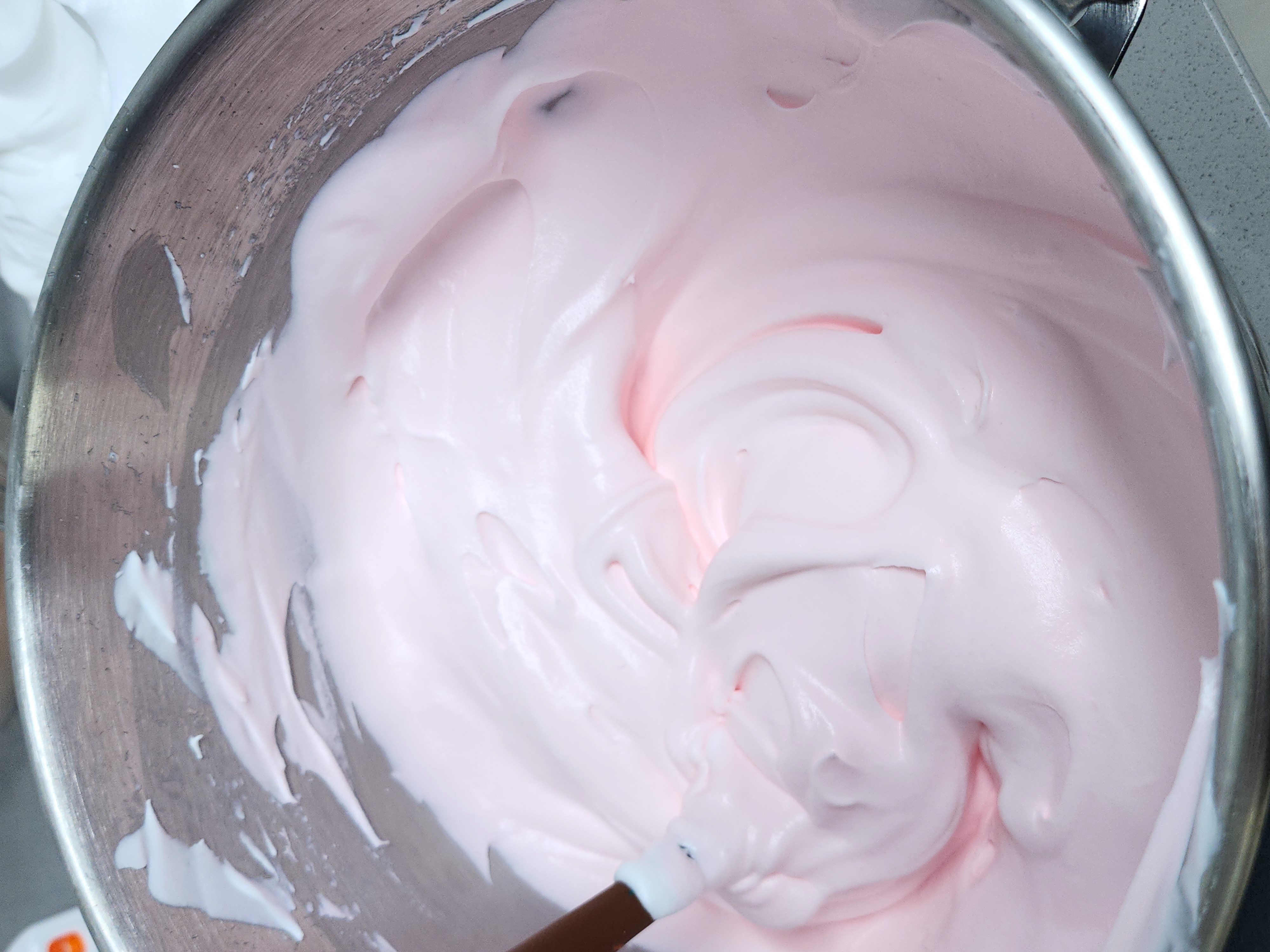 외부 작싱용 노란색, 분홍색, 흰색을 위해 일부를 따로 덜어 두고 레드 컬러 색소를 한 방울 정도 넣어 섞어 줍니다.