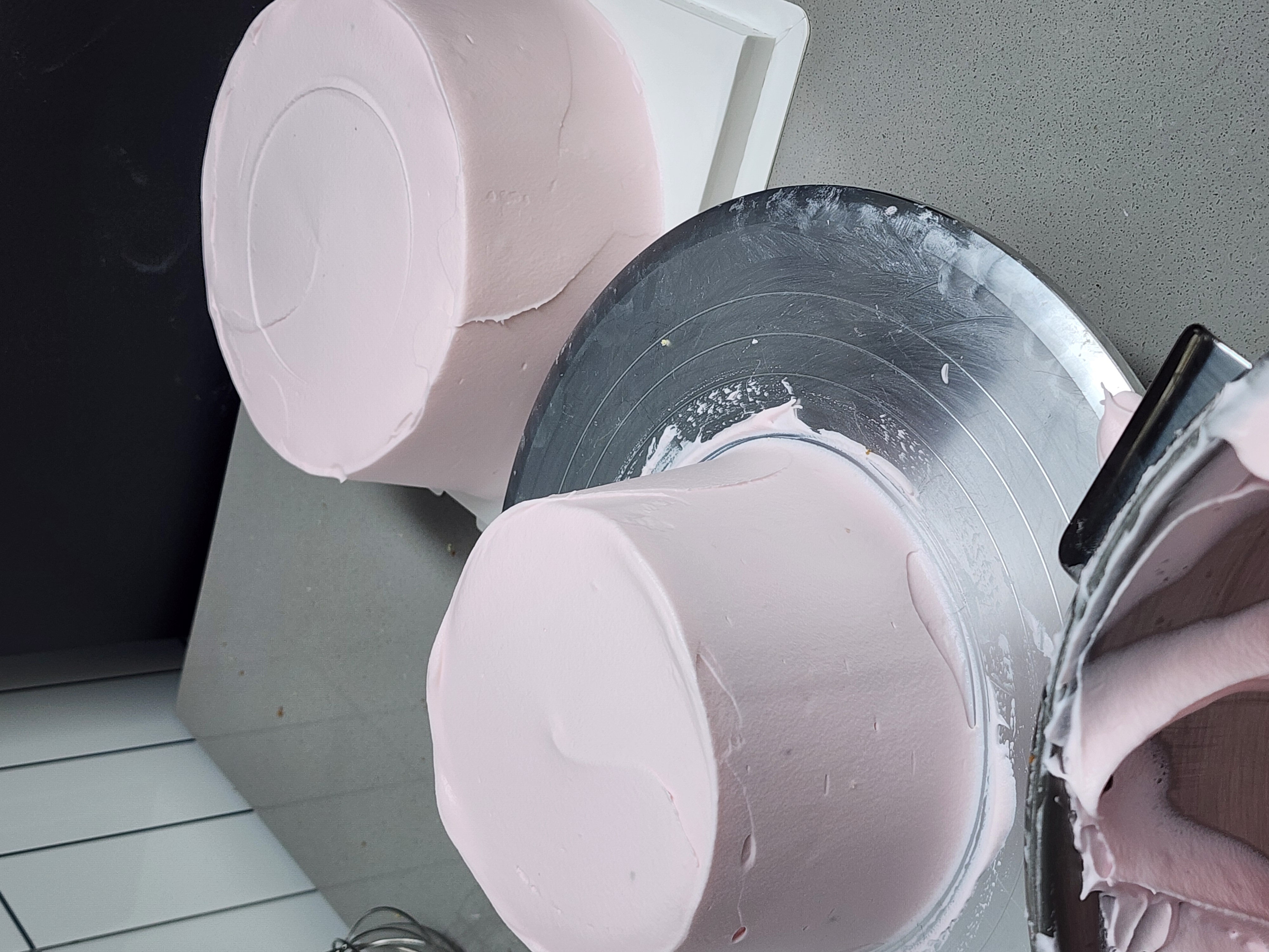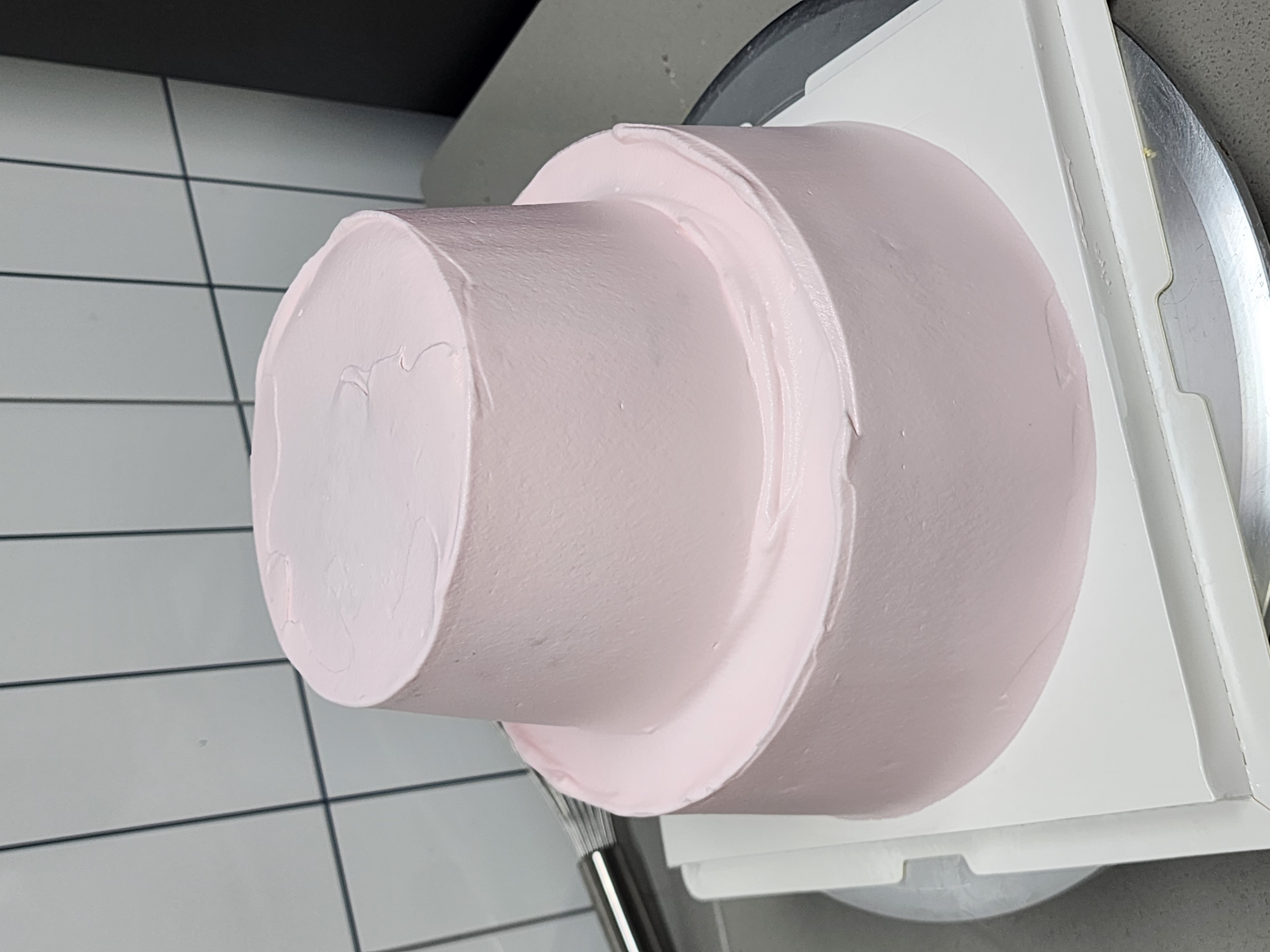 초코 크림이 샌딩된 1단에 분홍 크림을 올려 아이싱 해줍니다.