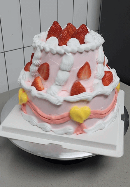 은은한 분홍빛 케이크인게 귀엽습니다.