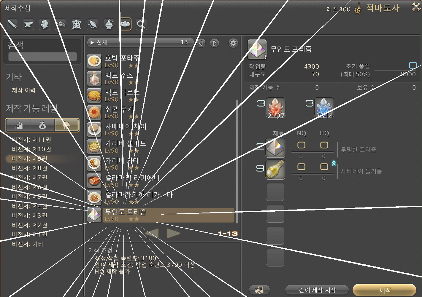 무려 이전 시즌 제작직 여러분이 엄청나게 드셨던 칼라마리 리피에니의 제작가능 조건 : 작업숙련도 3240과 비교해도 손색이 없는 적정 작업 숙련도 3180 라는 무시무시한 난이도를 자랑하는 요리입니다.