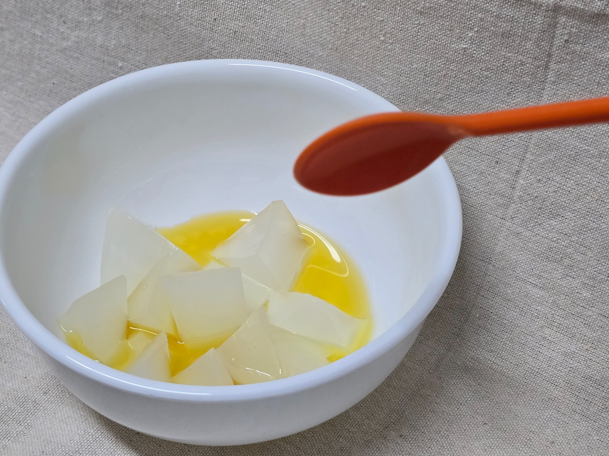 데쳐진 투명한 프리즘에 사베네어 들기름을 넣은 뒤 섞어줍니다.