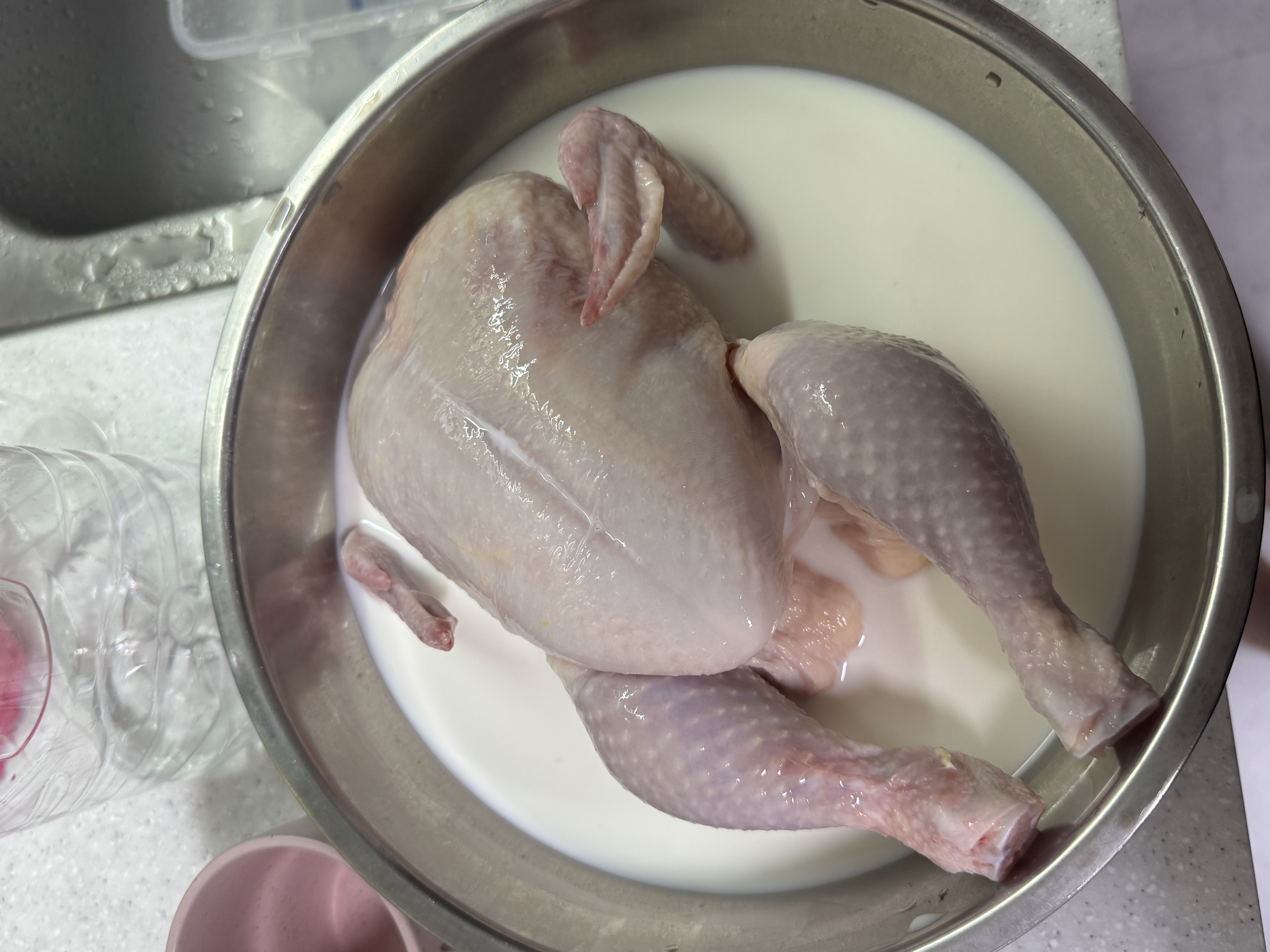 닭을 씻어서 우유에 재워줍니다. 저런 자세면 불편할 것 같네요.