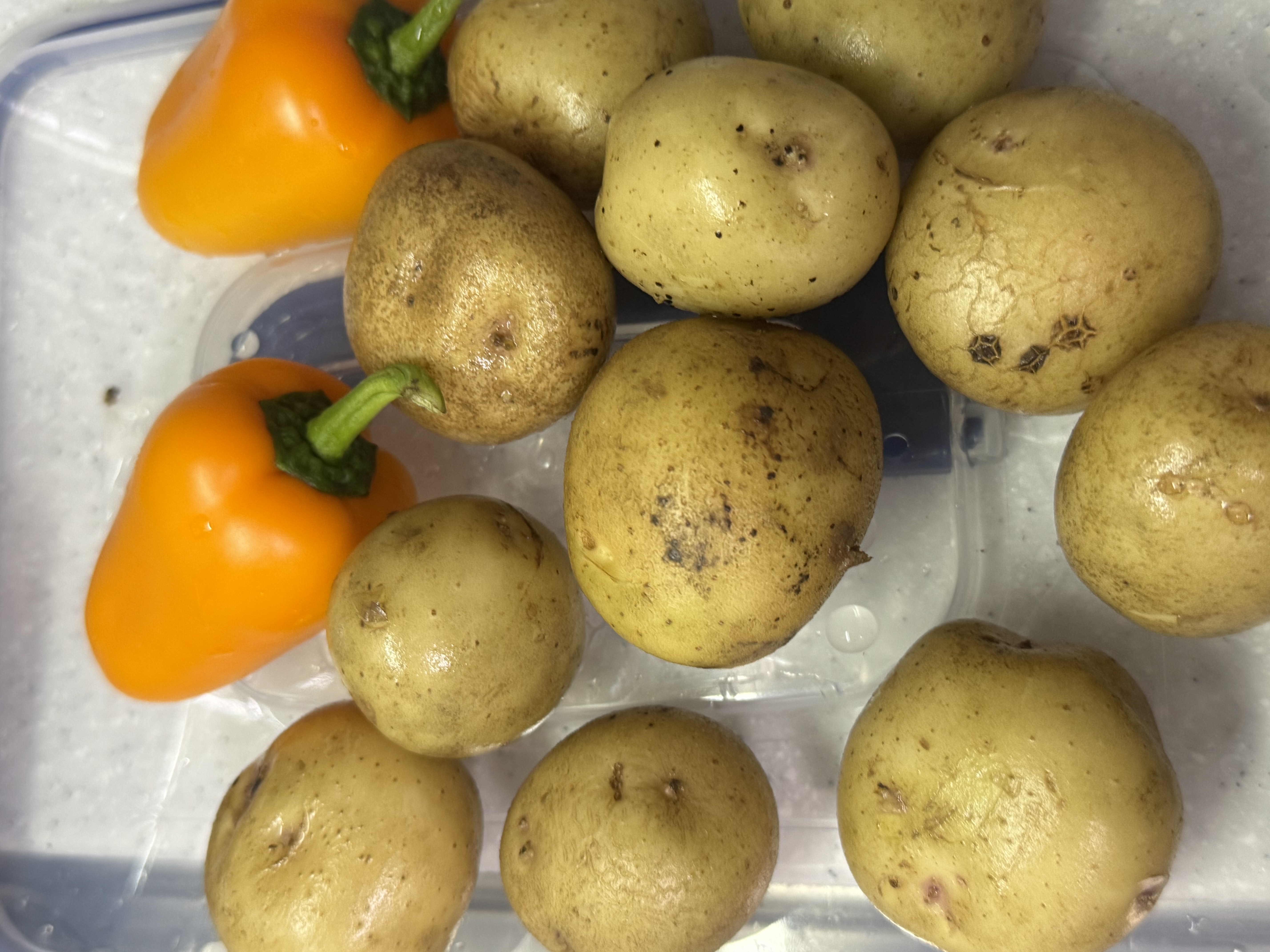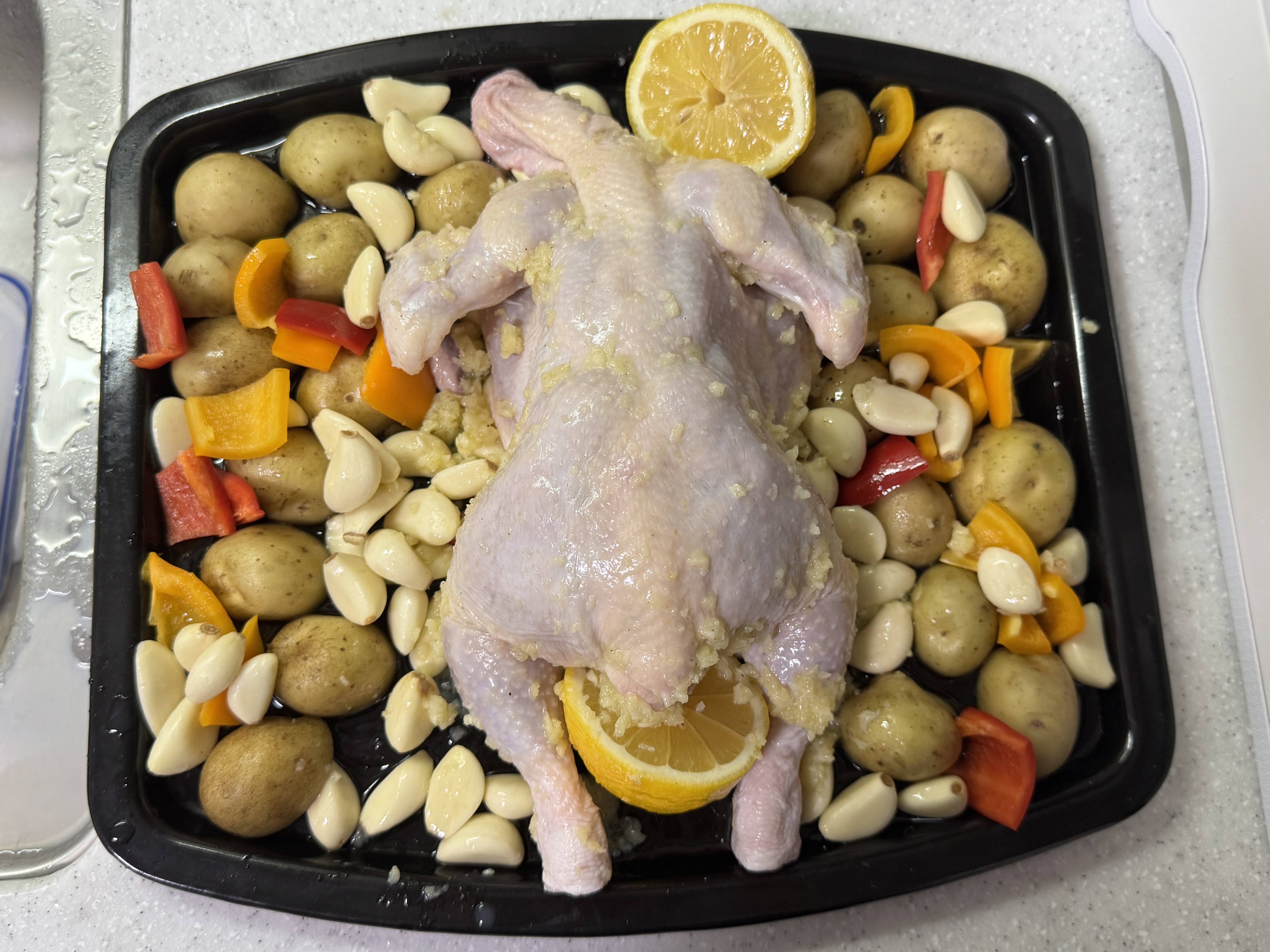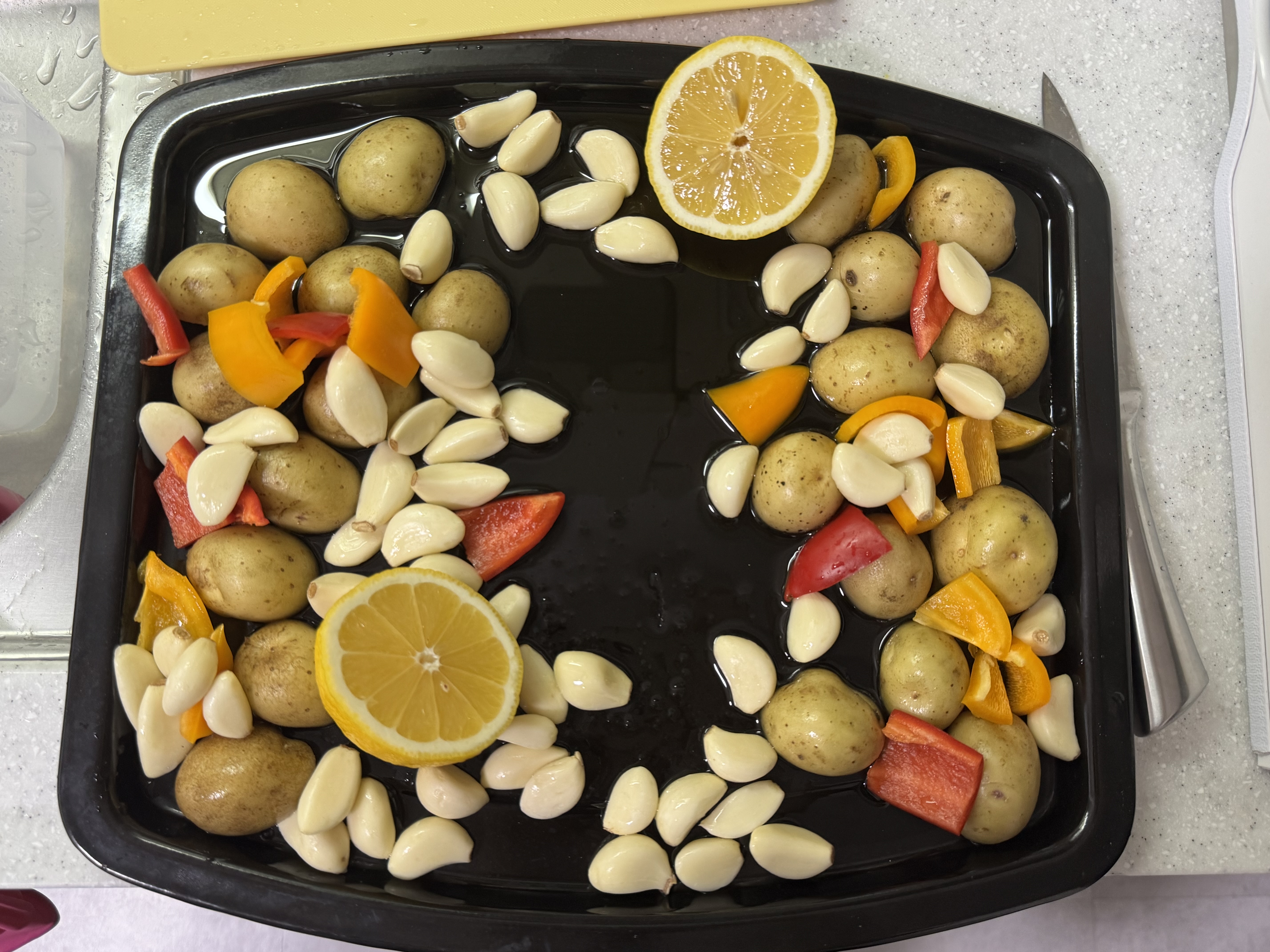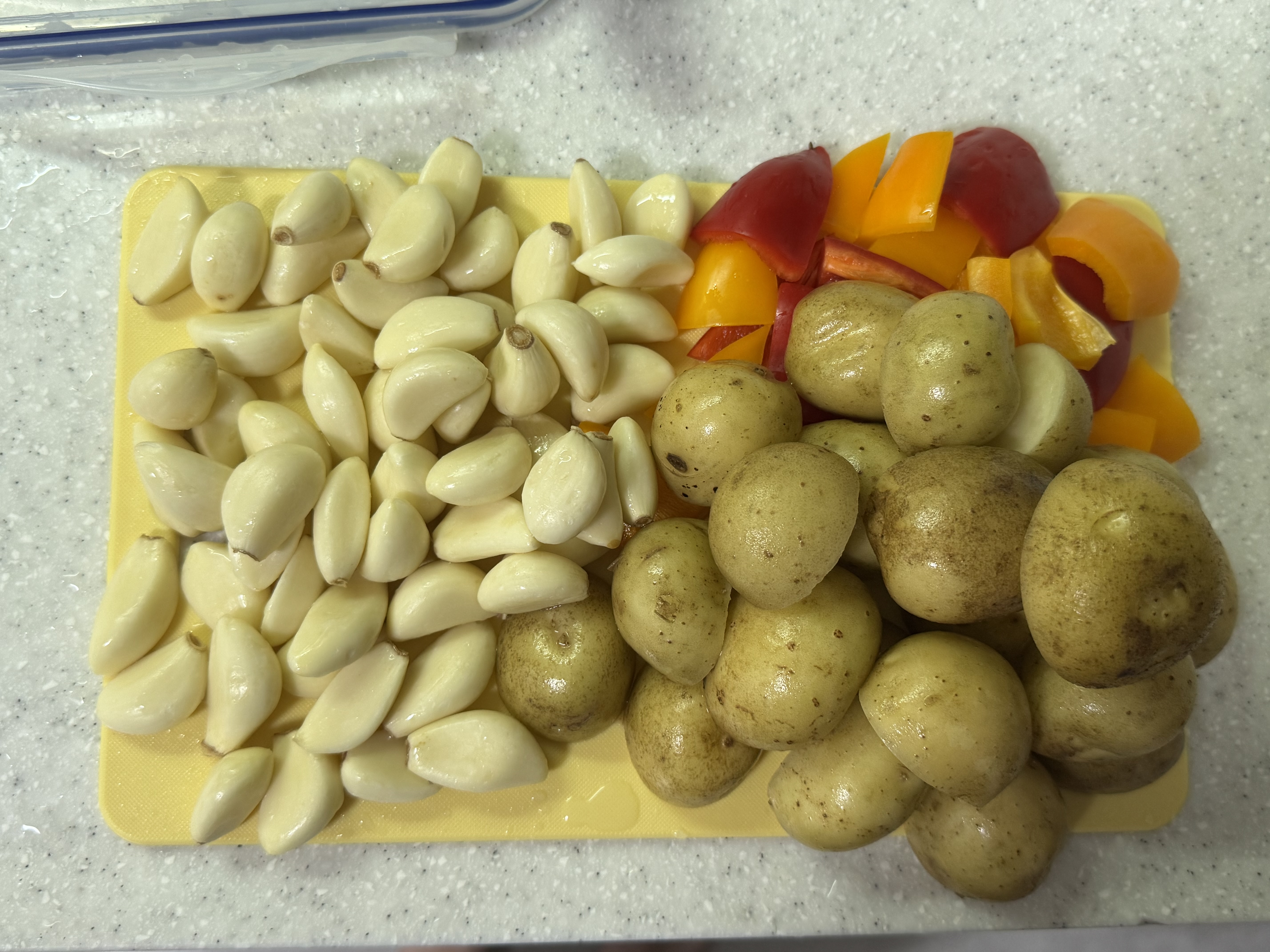 닭을 재워둔 동안 감자, 파프리카, 마늘, 레몬을 손질해줍니다.