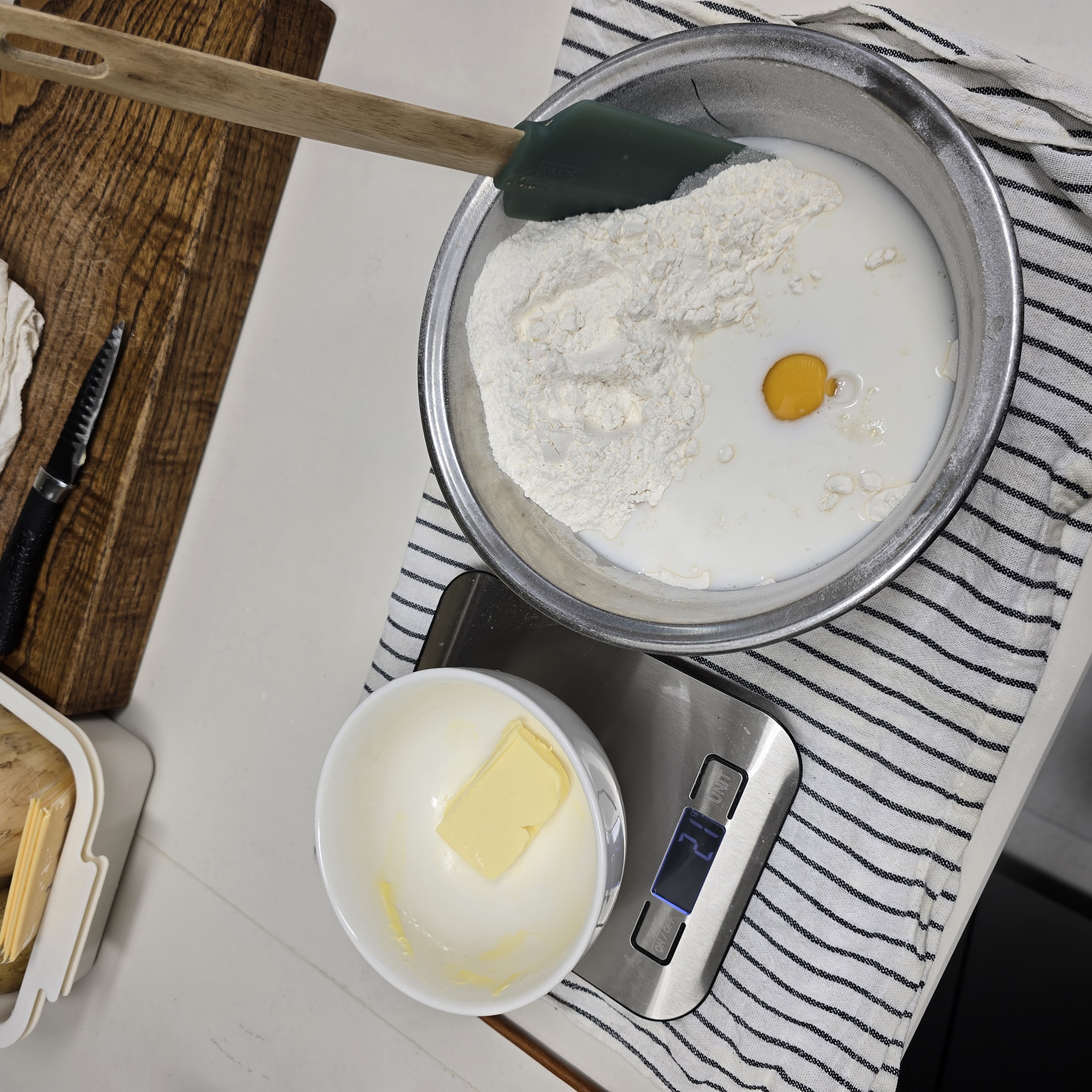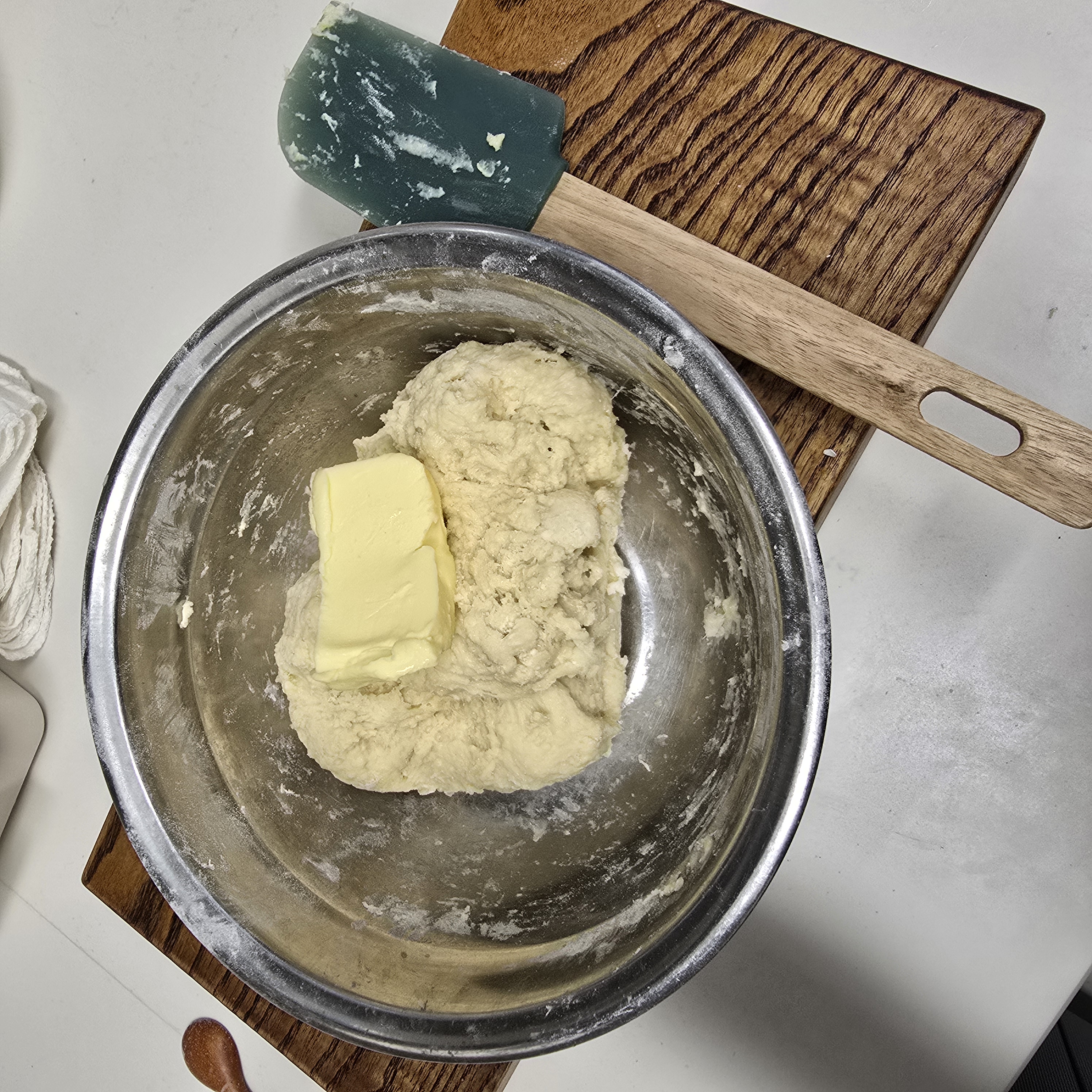 3. 반죽이 어느 정도 완성되면 실온에 있던 버터 20g을 넣어서 온전히 섞일 때까지 반죽해 줍니다.